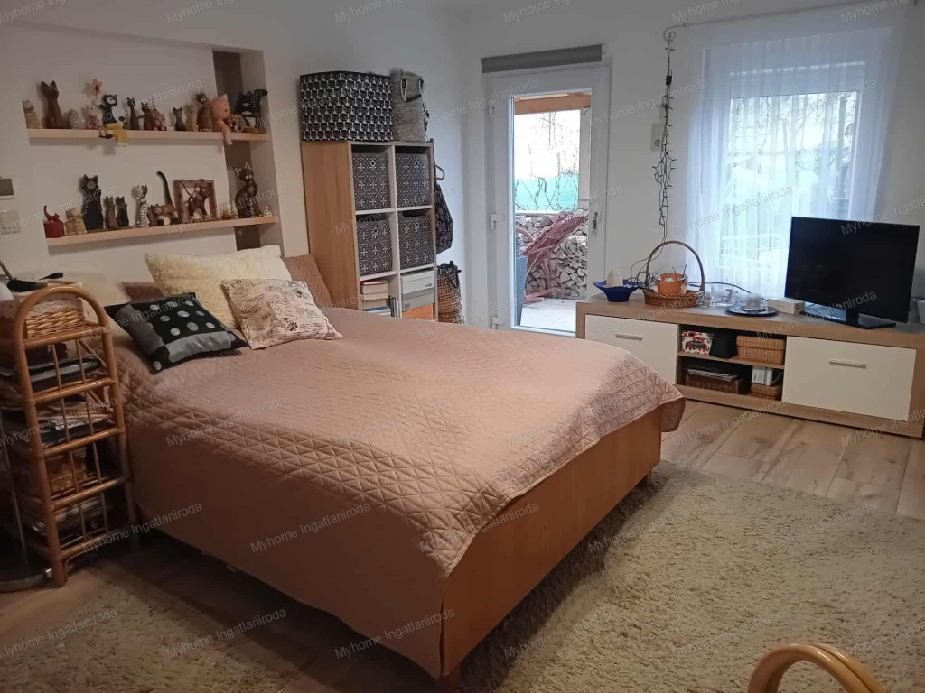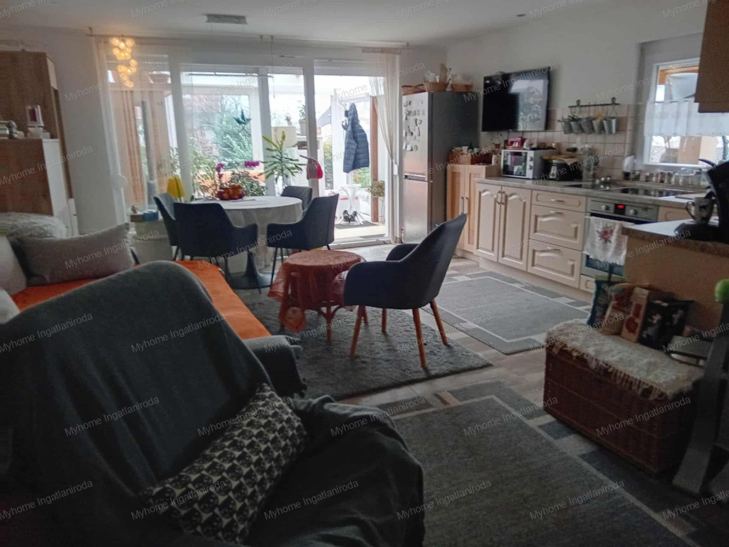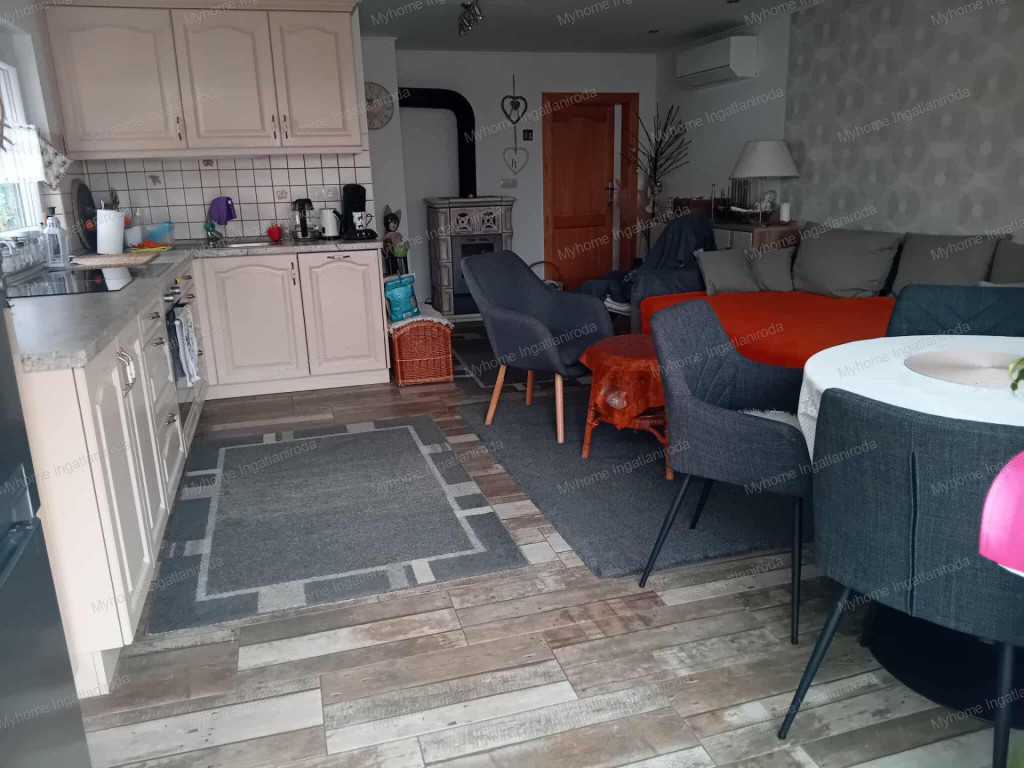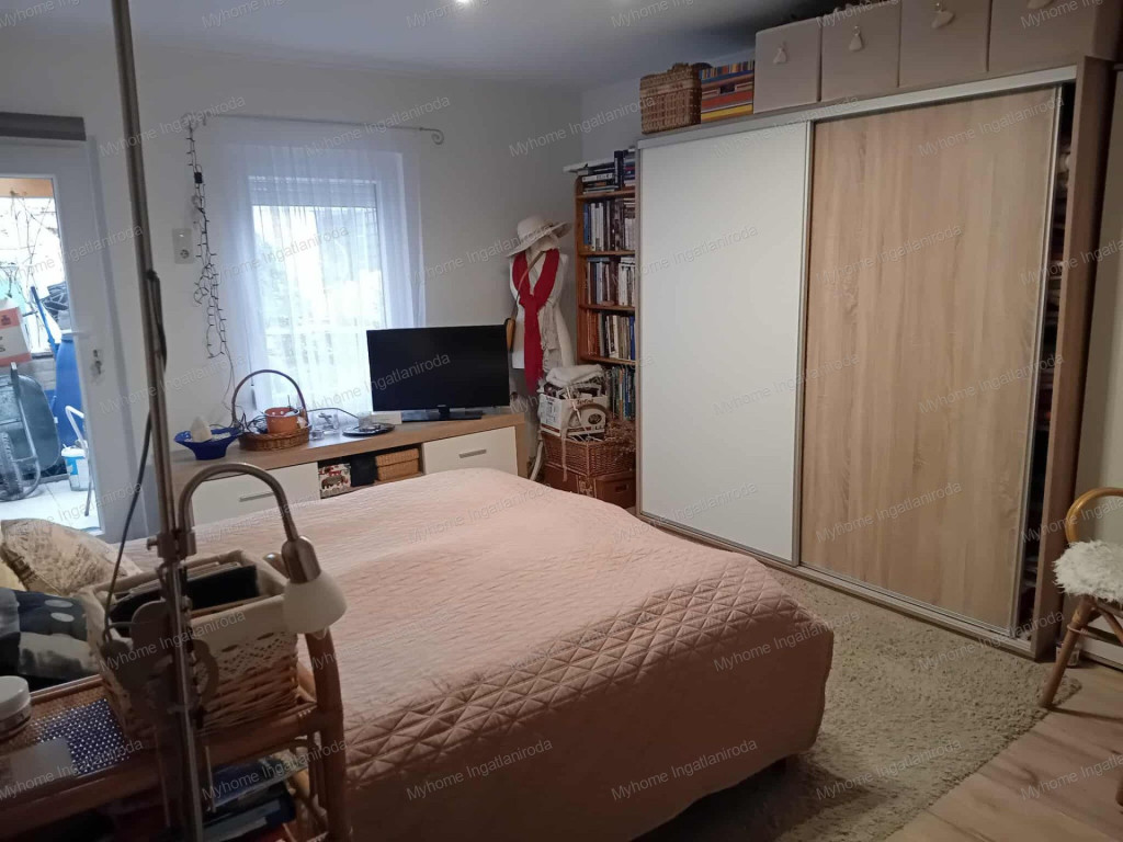 A ház 60 nm ( nappali- amerikai konyha, hálószoba, fürdő-wc, télikert) . A fűtött téikertben infraszauna került elhelyezésre. A ház belső oldalán tágas fedett terasz, az udvaron garázs és szerszámtároló található. Fűtése részben padlófűtés ( télikert, háló) részben klíma és cserépkályha ( nappali, fürdő). Gázcsonk a telken belül van. A ház 10 cm vastag szigetelésének is köszönhetően barátságos rezsivel bír. A széles utcafrontú telek egyrész esztétikus térkövezést kapott, a fennmaradó rész parkosított és gyümölcsfákkal beültetett.