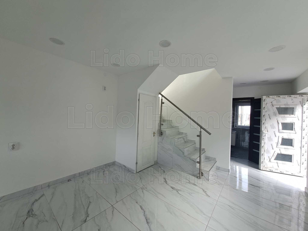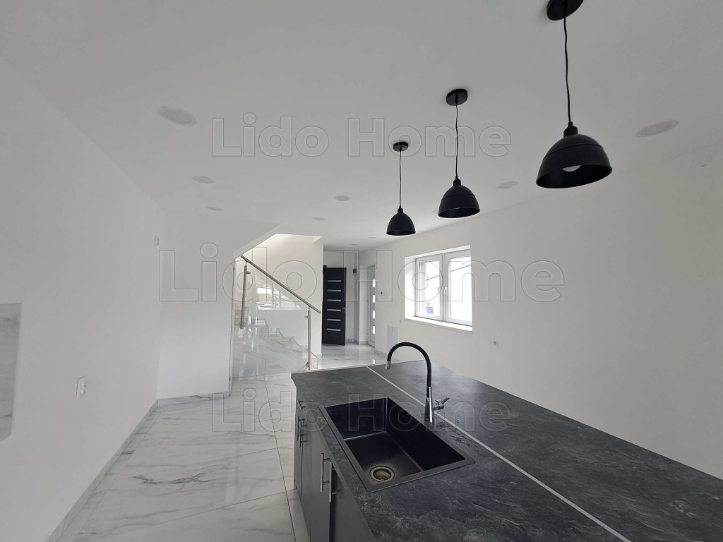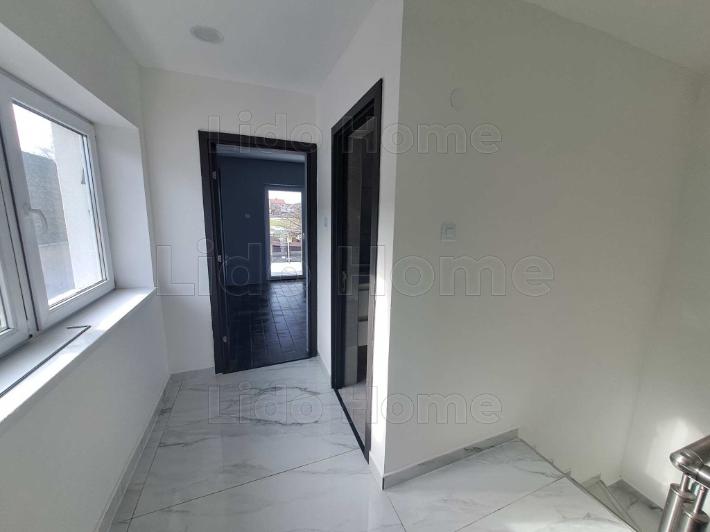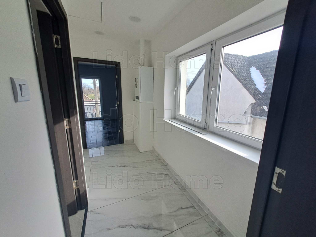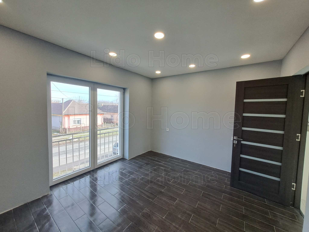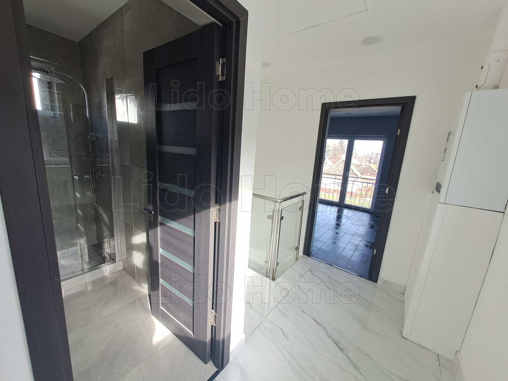 A földszinten egy tágas, 32 m²-es konyha került kialakításra, amelyből közvetlen kijárat nyílik a 12 m²-es hátsó teraszra, ideális helyszínt biztosítva pihenéshez vagy családi összejövetelekhez. Ezen a szinten található továbbá egy szoba, egy fürdőszoba, valamint a lépcső alatt kialakított praktikus tároló. Az emeleten két külön nyíló szoba, egy fürdőszoba és egy előszoba kapott helyet, az egyik szobából pedig erkély nyílik az udvar felé, nyugodt, zöld panorámával.