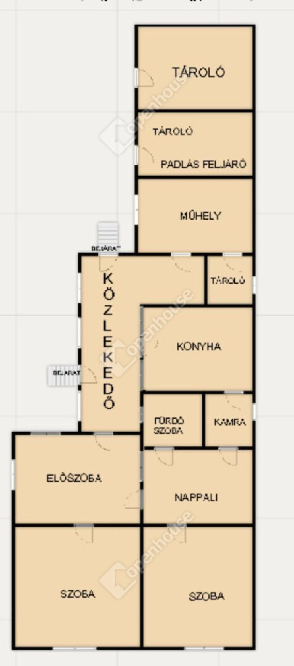 Belső elrendezése jelen kialakításában: bejárat két irányból adott, közlekedő, előszoba, két kényelmes méretű külön nyíló szoba, nappali, fürdőszoba, kamra, konyha, műhely, tároló.