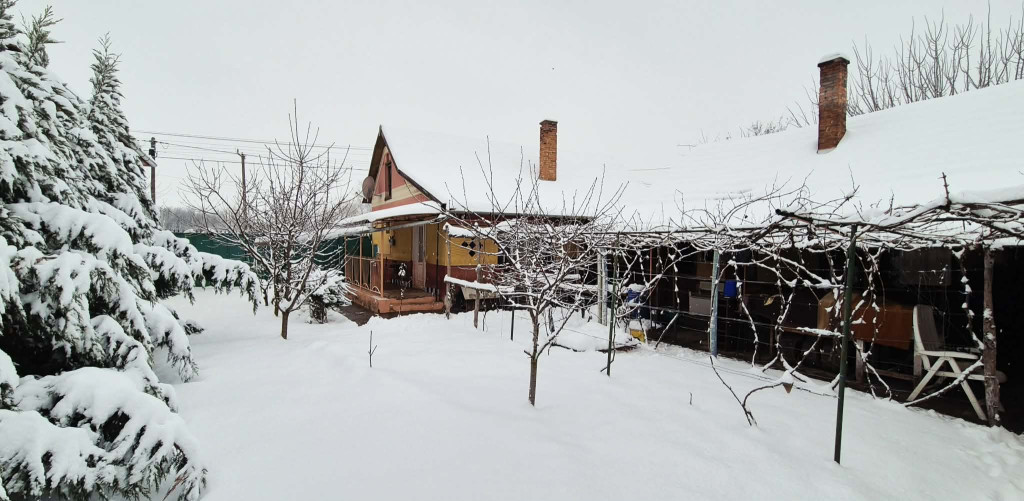 Eladó Kistelek egyik békés részén egy 56 m²-es vályogház a hozzá tartozó 15 m²-es melléképülettel és 720 m²-es gondozott telekkel, amelyet gyümölcsfák és kerti növények díszítenek.