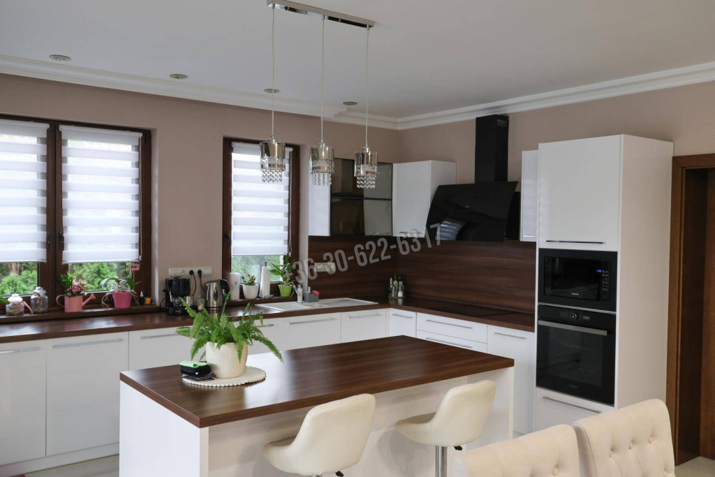 A gépesített, magasfényű konyha központi szigettel, prémium beépített készülékekkel és kristálylámpákkal a gasztronómia szerelmeseinek álma.