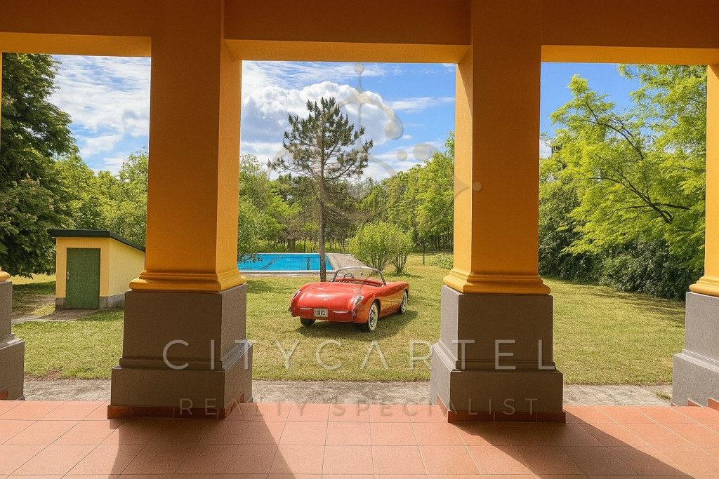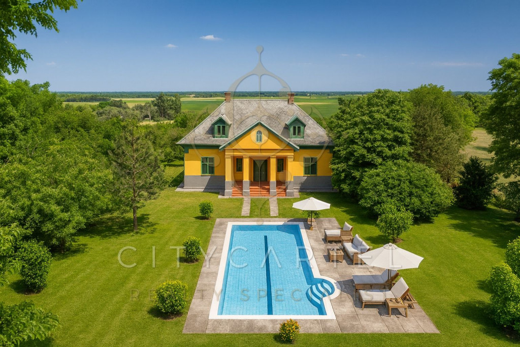 A kúria előszobája finoman visszhangozza a lépések neszét. A könyvtárszoba félhomályában a napfény vékony aranycsíkokban érkezik, lágyan megpihenve a könyvek gerincén. A nappali padlója halk sóhajjal engedi a járást, a cserépkályhák még őrzik a tegnap melegét. A kert felé kilépve a lombok közt átsuhanó szellő az arcot simogatja, a medence vize mozdulatlan, akár egy zöld bársonyra helyezett drágakő.