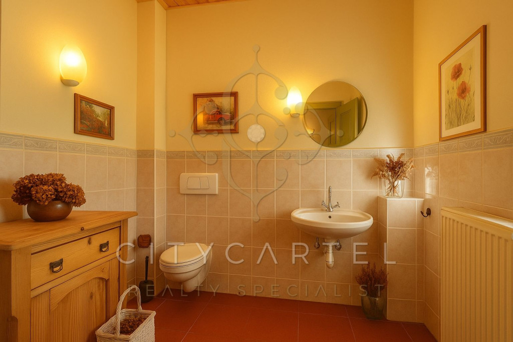 A villa keleti teraszát szinte öleli a napfény. A dombtetőről a tekintet aranyló gabonatáblákon és zöld erdősávokon siklik végig. Bent a nappaliban a fény és árnyék lassú táncot jár a falakon, a konyhából friss kenyér illata terül szét. A pince mélyén sorakozó borospalackok és a biliárdasztal mellett függő lámpa egy nyugodtabb korszak hangulatát idézi.