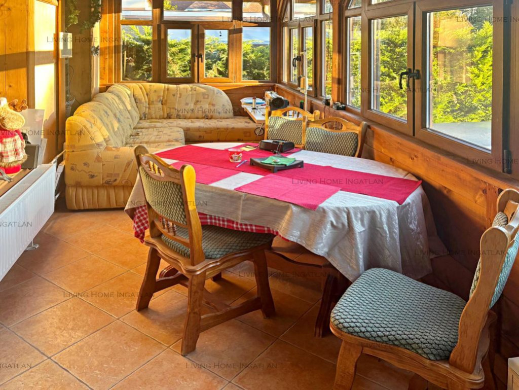 The large windows of the living room on the upper floor offer a magnificent panoramic view of the Danube. There is a fully equipped kitchen, a bathroom with a massage tub, a bedroom, and storage rooms.