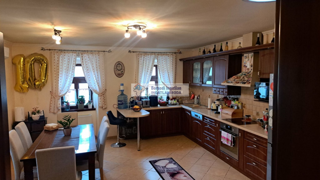 A 30 m²-es konyha-étkező, ahol a családi események rendszeresek, a baráti borospohár koccanása természetes hang.