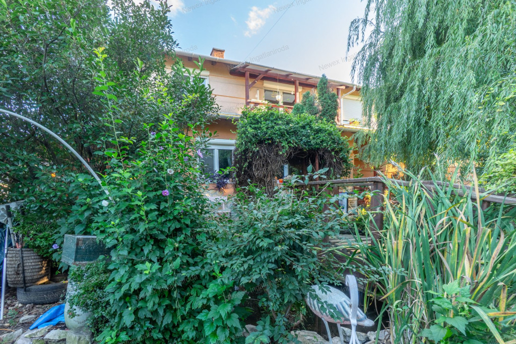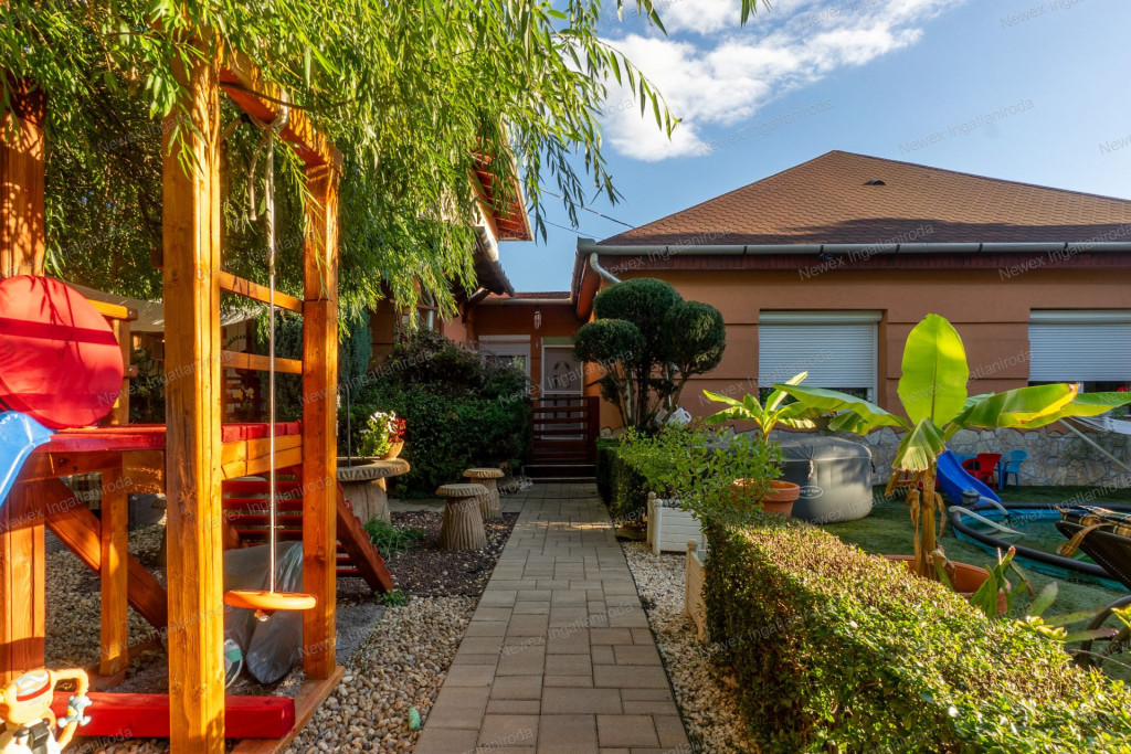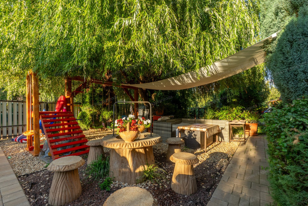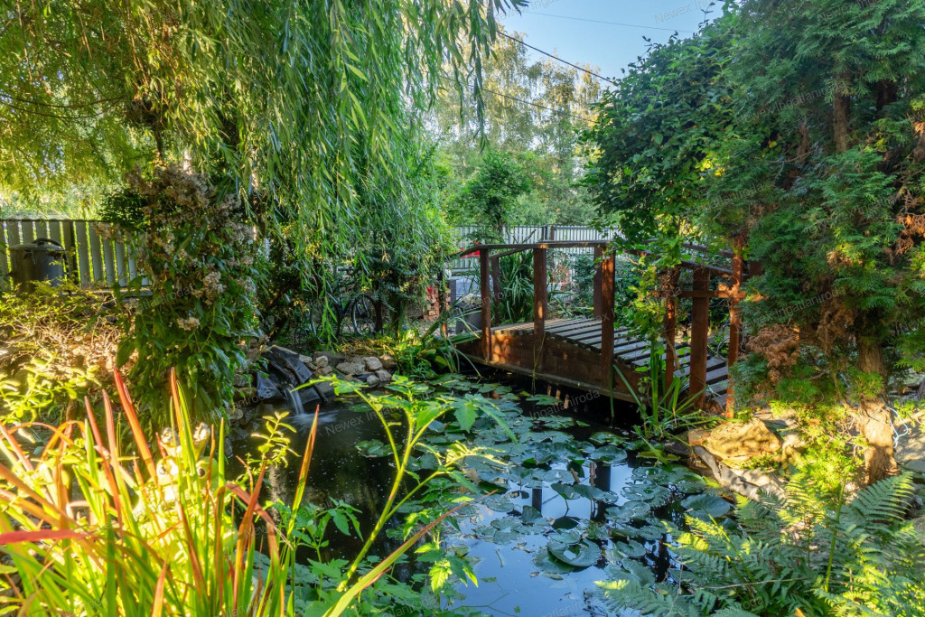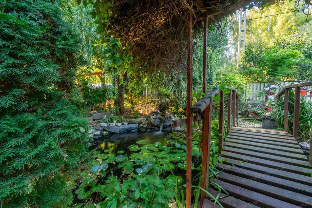 A parkosított, arborétum jellegű kert különleges atmoszférát teremt: saját halastó híddal, gondozott növényállomány, szalonnasütő és hangulatos pihenőrészek szolgálják a kikapcsolódást. Az ingatlan alatt pince is található.