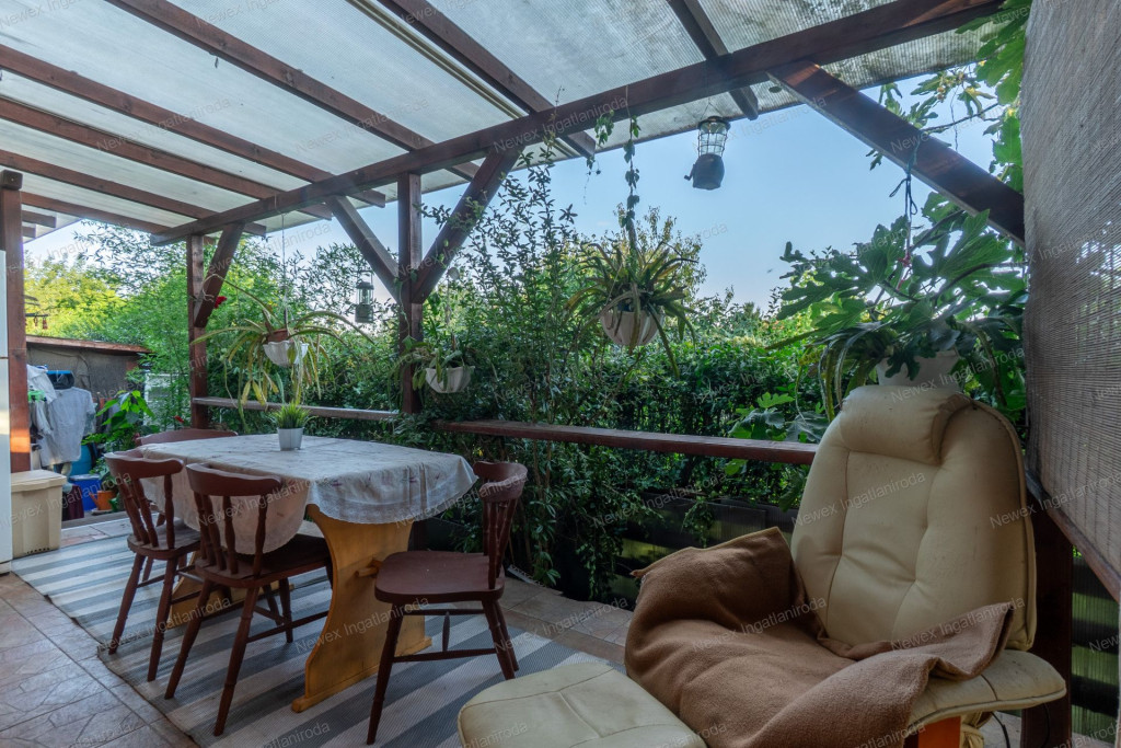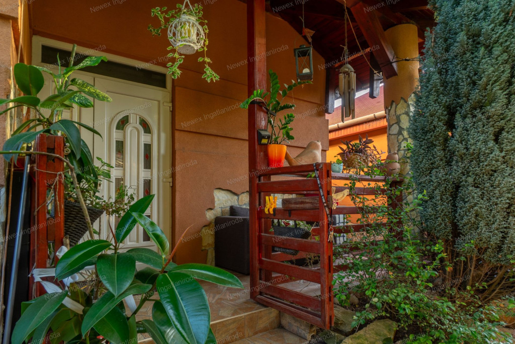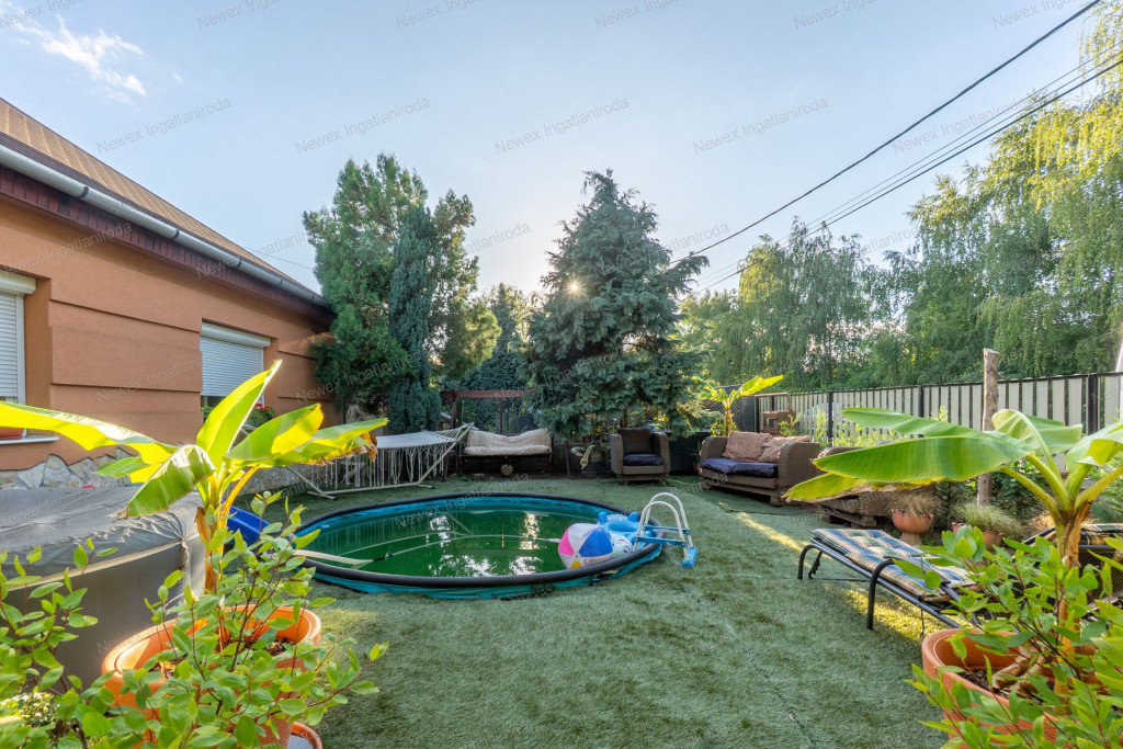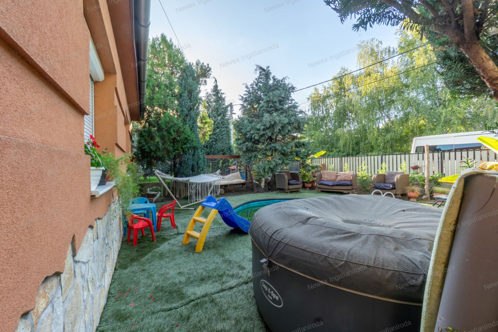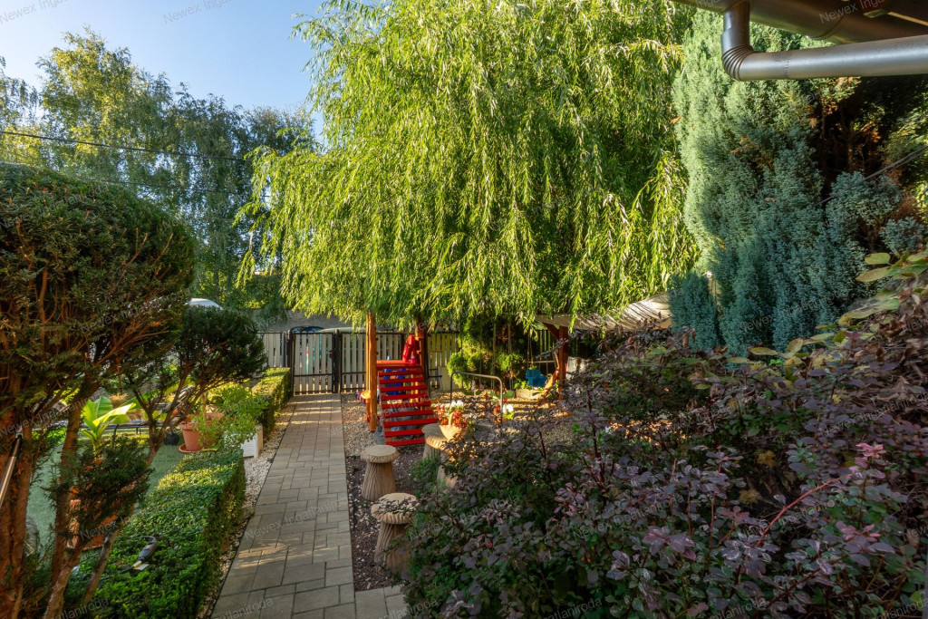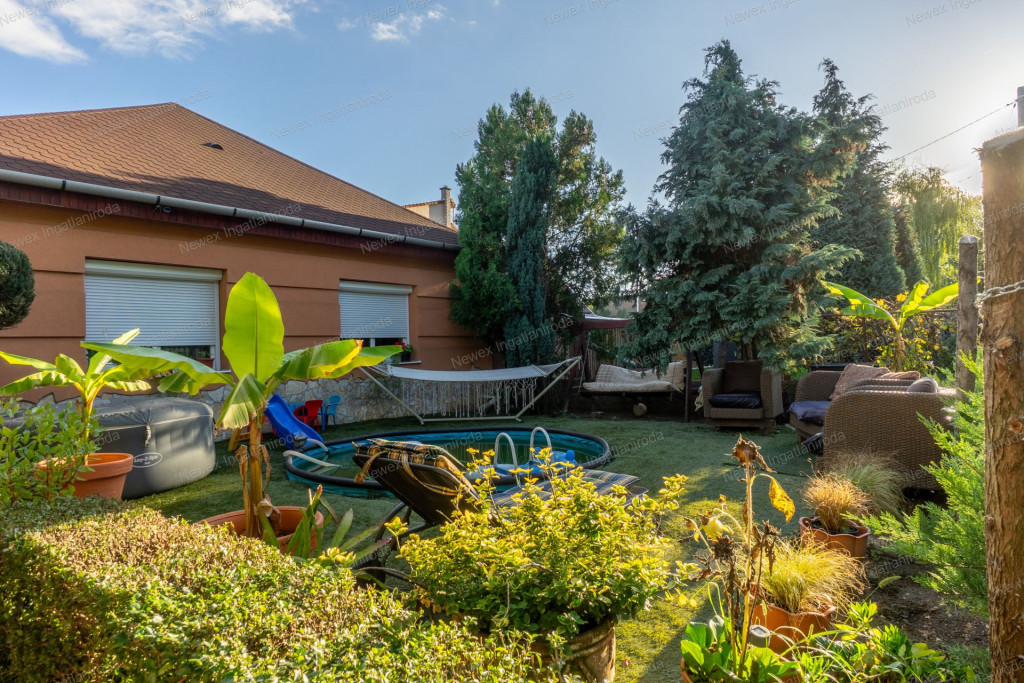 A parkosított, arborétum jellegű kert különleges atmoszférát teremt: saját halastó híddal, gondozott növényállomány, szalonnasütő és hangulatos pihenőrészek szolgálják a kikapcsolódást. Az ingatlan alatt pince is található.