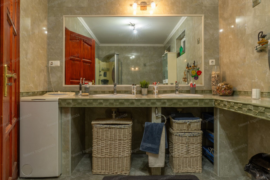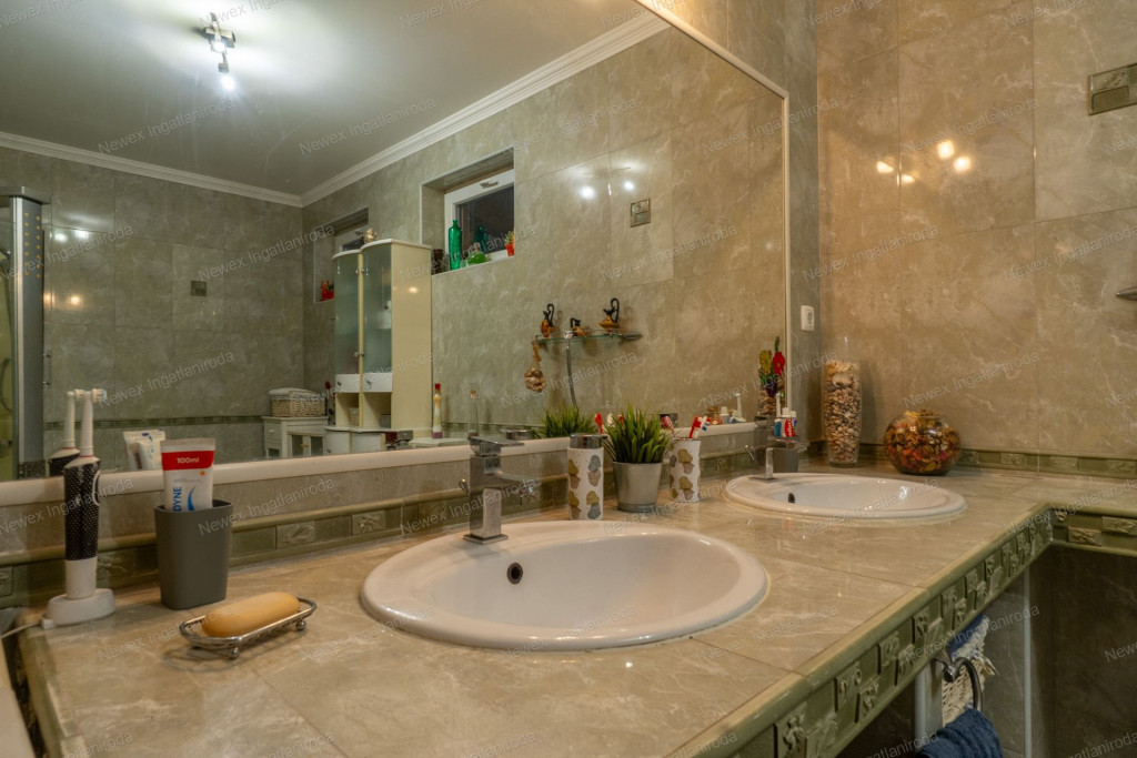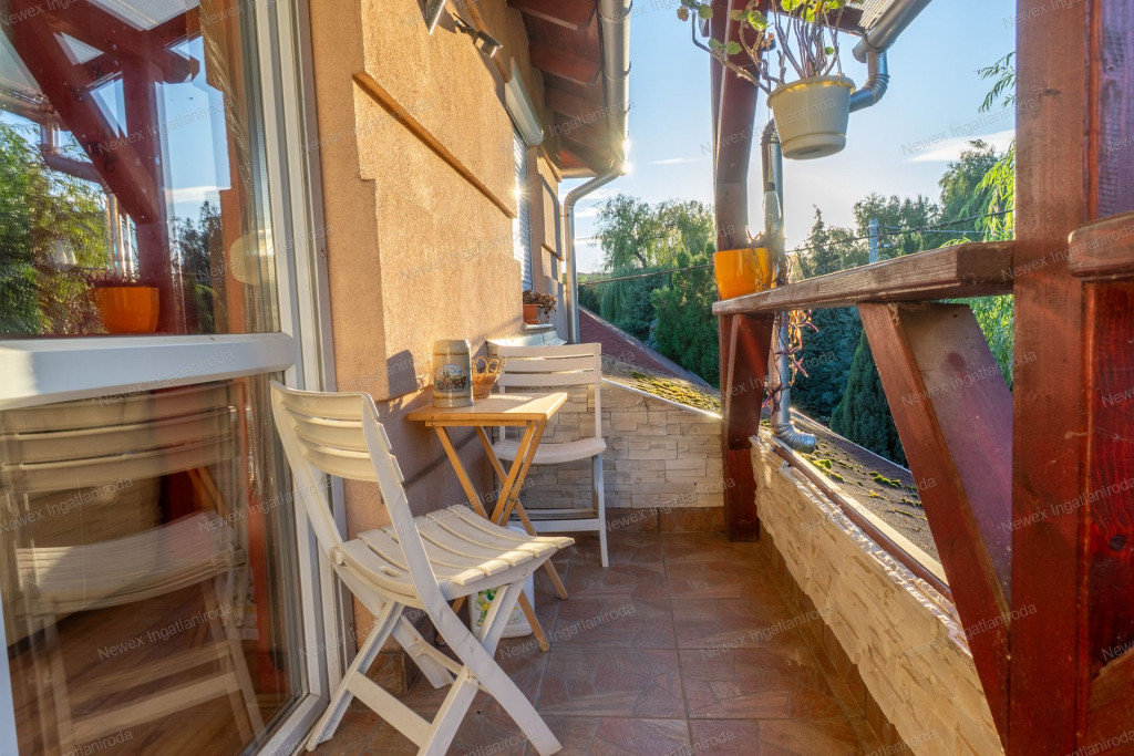 Az újabb ház földszintjén előtér, nagy méretű nappali étkezővel, hatalmas konyha, hálószoba, továbbá egy duplamosdós, sarokkádas fürdőszoba és külön WC kapott helyet. A nappaliból közvetlen kijárat nyílik a 28 m²-es fedett teraszra. Az emeleten egy nappali, két hálószoba, gardrób, valamint újabb fürdőszoba és WC található, melyhez erkély is kapcsolódik gyönyörű kertre néző kilátással.