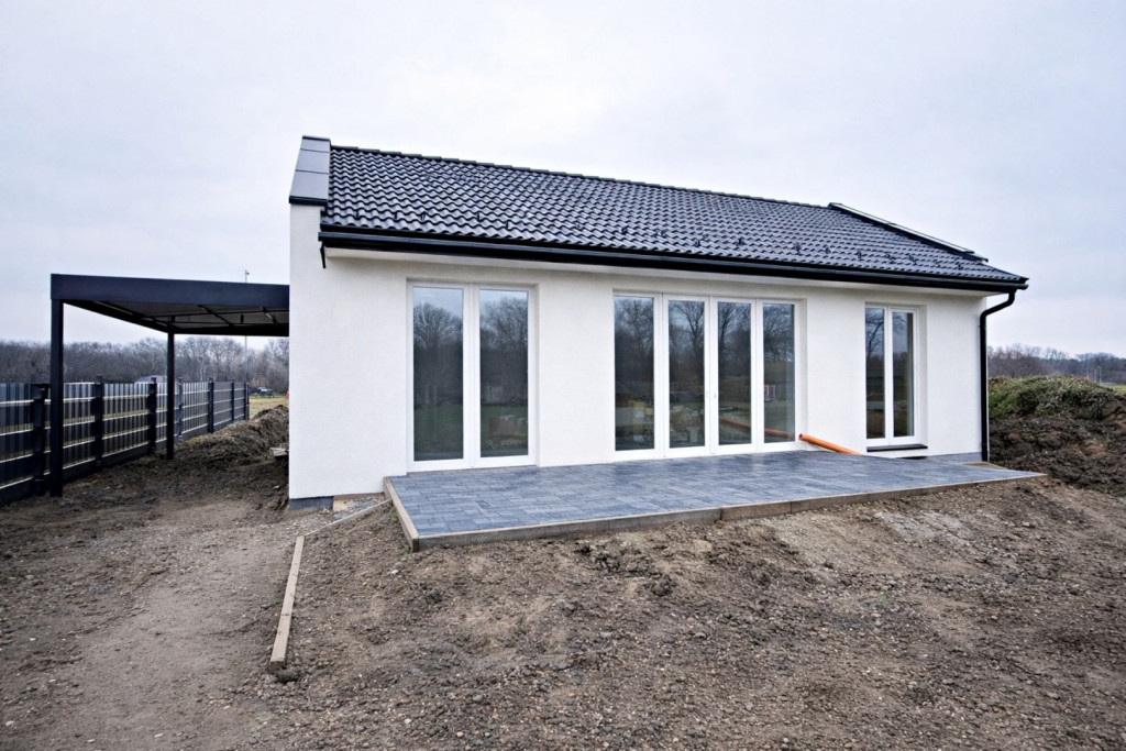 A 74,98 m2-es, L2 ház helyiségei: amerikai konyhás nappali, 3 hálószoba, fürdőszoba, WC, előtér, és 23 m2 terasz. Az ingatlanhoz tartozik 1 db fedett kocsibeálló.