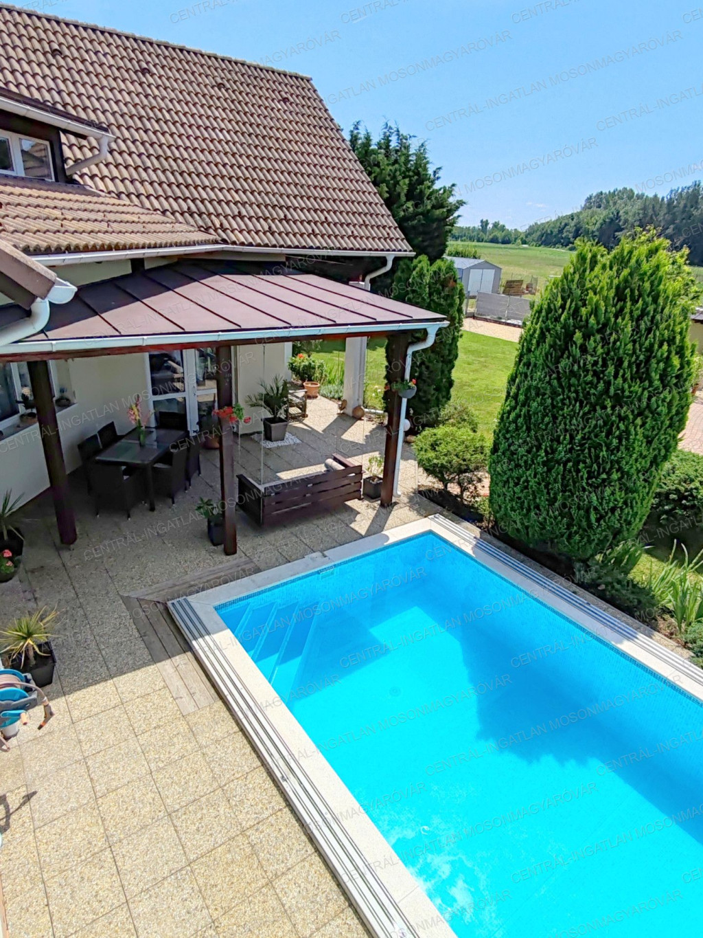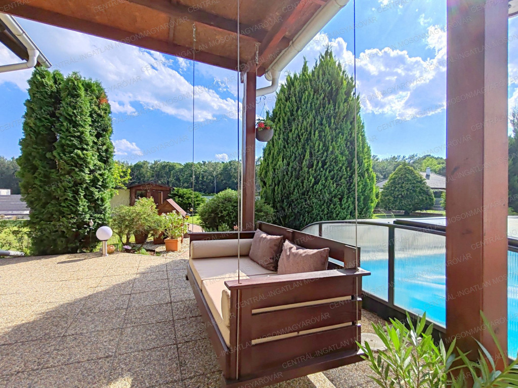 -Dupla garázs, panorámás tetőterasz, fedett medence, 30m-es kerti ház, 67m2 kertre néző terasz.