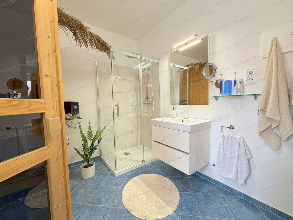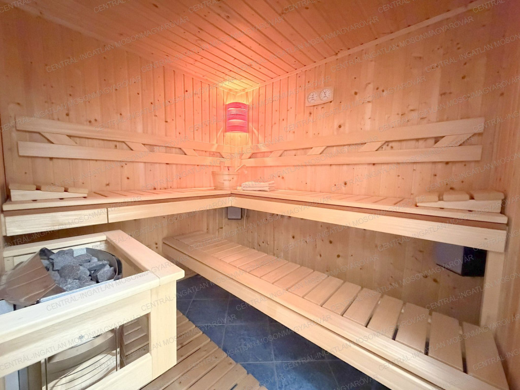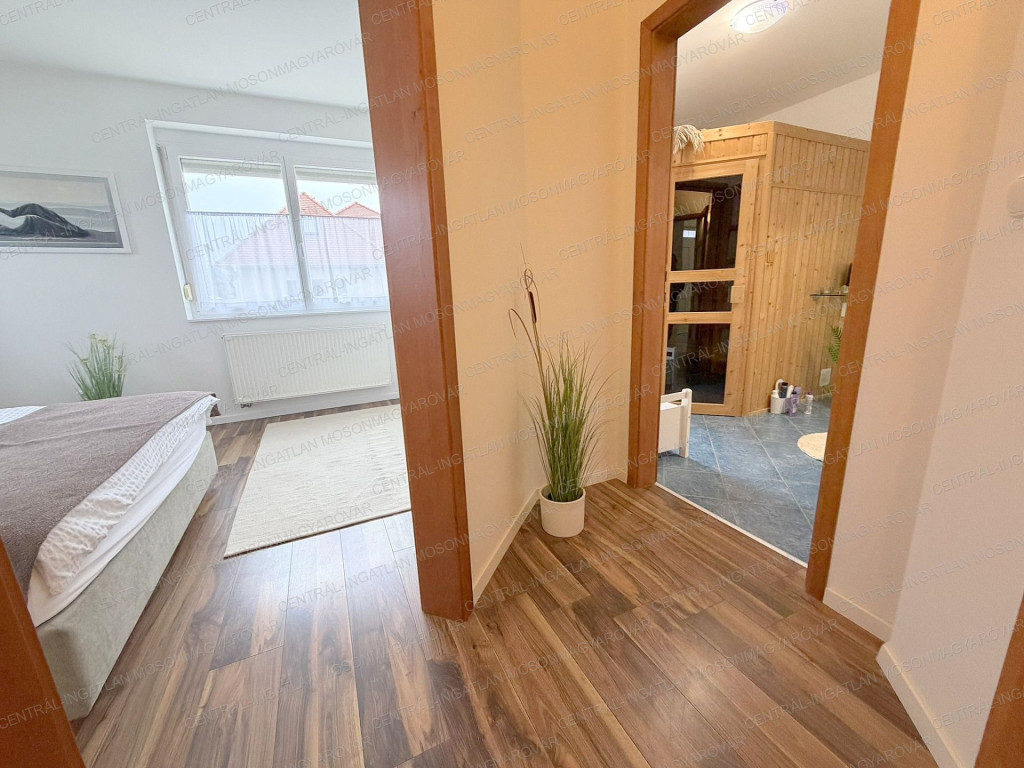 -A földszinten található még egy önálló hálórész: tágas hálószobával, saját fürdővel, szaunával, wc-vel.