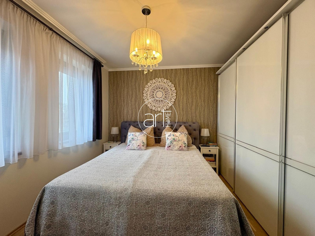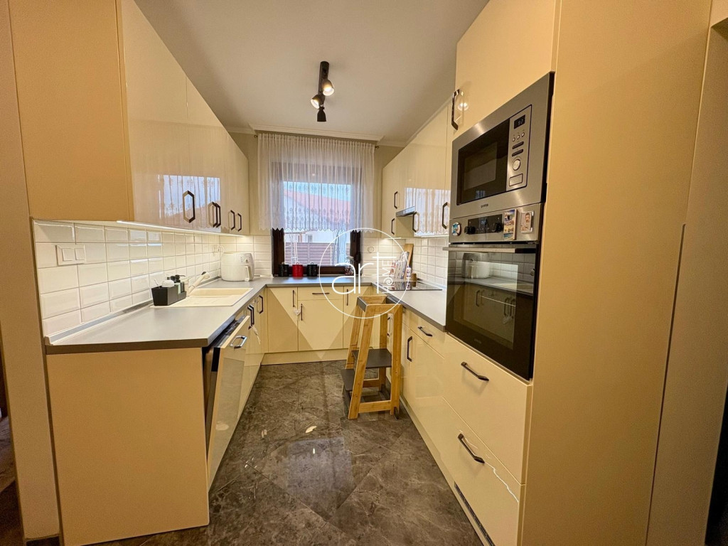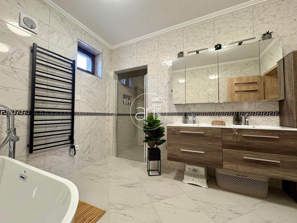 A gépesített konyha nemcsak esztétikus, hanem praktikus is: külön kamra tartozik hozzá, valamint dupla hűtő szolgálja a család kényelmét. A ház hátsó részében három külön bejáratú, kertre néző, szép világos hálószoba található, amelyek tökéletes nyugodt teret biztosítanak a pihenéshez, gyerekszobának vagy akár otthoni dolgozószobának is. A tágas fürdőszobában fürdőkád, tusoló, dupla mosdó és WC is helyet kapott, emellett külön vendég WC kézmosóval is rendelkezésre áll – egy nagyobb család számára is kényelmes megoldás.
