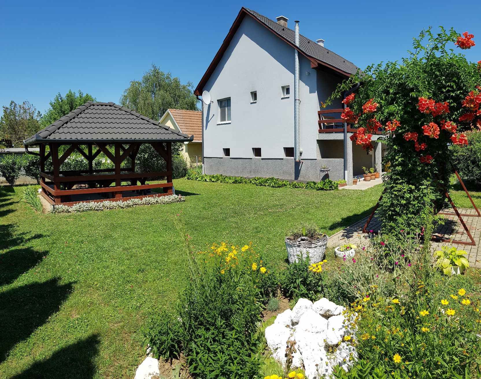A telek mérete 1413 nm, a pihenőkertben családi és baráti összejövetelekre lehetőséget ad a hatalmas filagória. A kertben található egy szerszámtároló faház is.