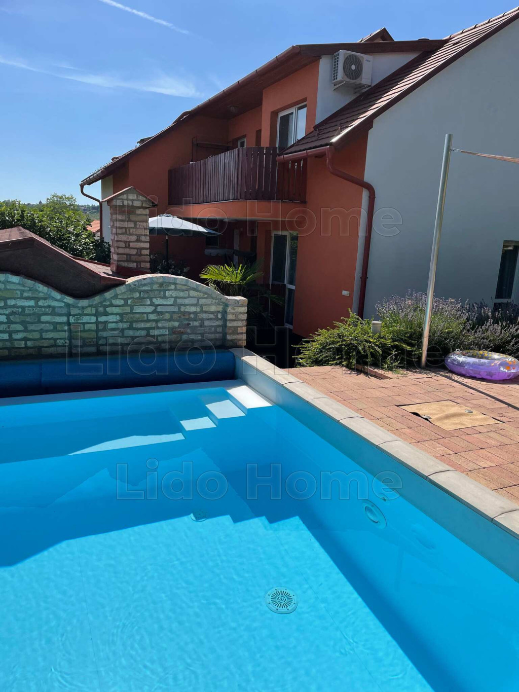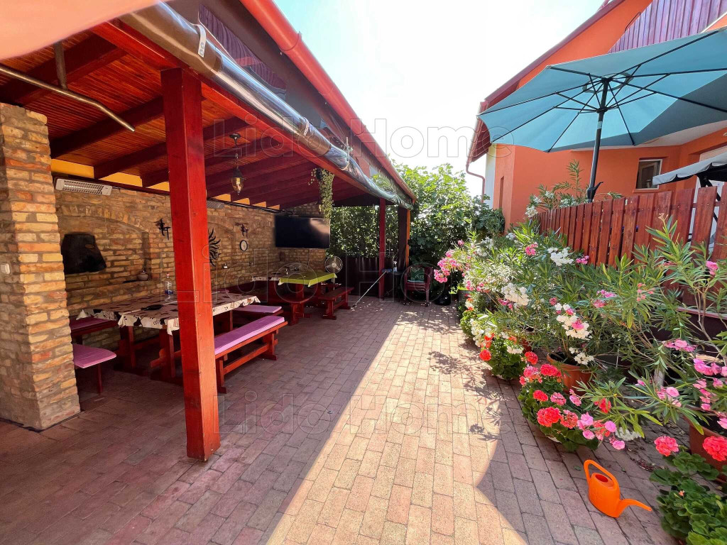 A gondozott udvaron egy közel 40 m²-es fedett terasz található nyári konyhával és épített kemencével, valamint egy hőszivattyúval fűthető medence biztosítja a kényelmet és a kikapcsolódást.