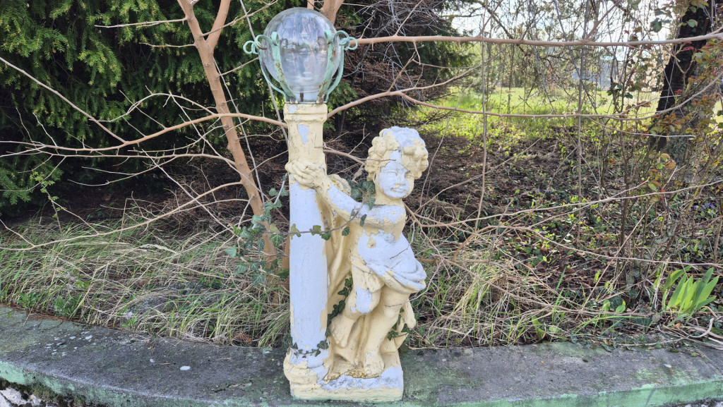 gondozott, gyümölcsfás kert, térkövezett udvar