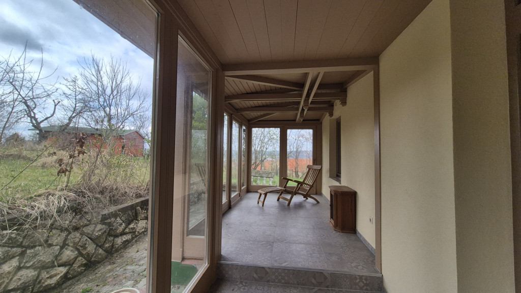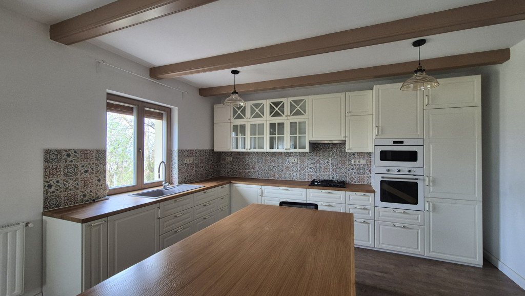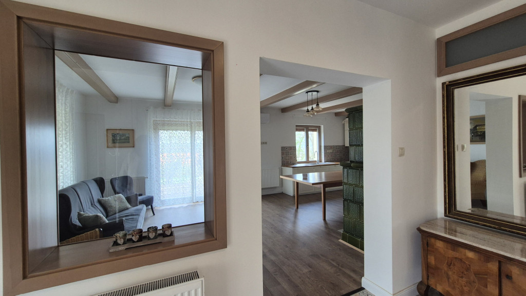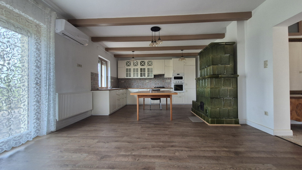 -30 m²-es nappali–konyha–étkező egy légtérben, gyönyörű működő cserépkályhával, modern gépesítéssel, közvetlen teraszkapcsolattal