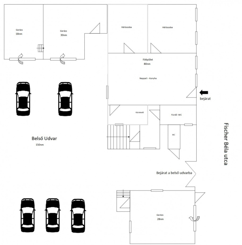 A belső udvar teljesen aszfaltozott, dekorációként 30 éves pálmákkal fehér kavicságyással a kerítés mentén tujákkal lett díszítve.