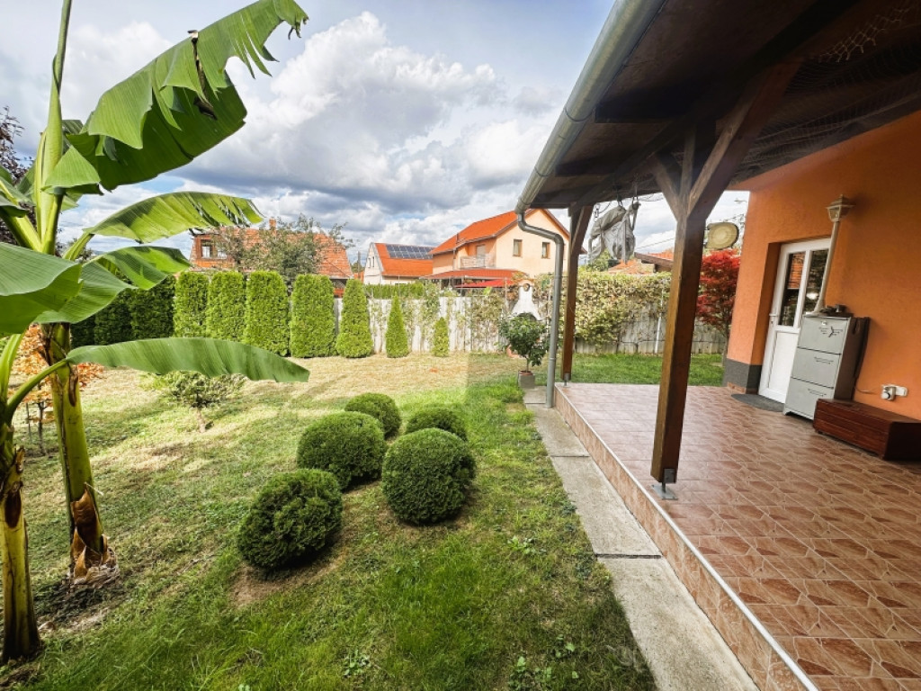 A 406 m?-es telek igazi ékszerdoboz: szépen gondozott udvar, örökzöldek, gyümölcsfák, fedett terasz és kerti grillező biztosítja a családi összejövetelek vagy a baráti esték hangulatát. A kertben még különleges dísznövények, sőt banánfa is helyet kapott, ami igazán egyedi hangulatot ad.