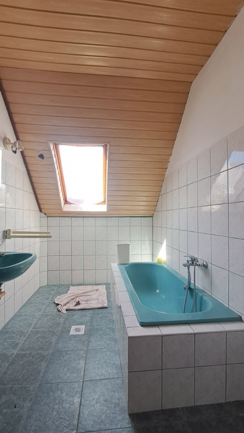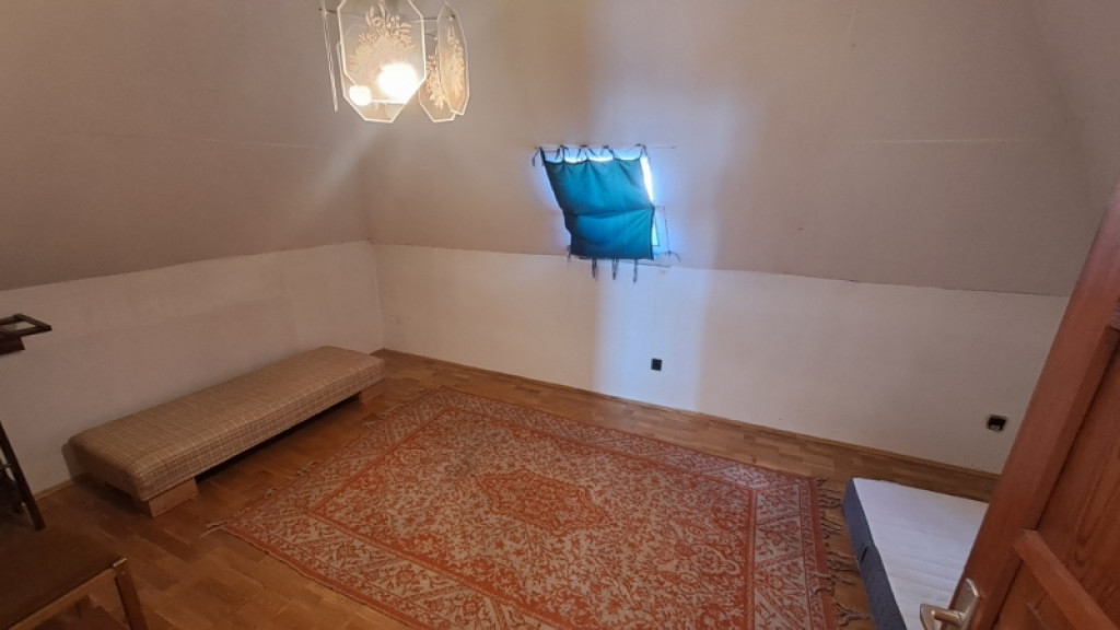 A felső szinten egy nappali, 2 szoba, konyha + étkező, egy fürdőszoba és egy külön WC került kialakításra.