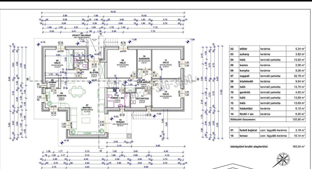 A lakóépület bruttó alapterülete 184 nm, a hasznos belső területe: 136 nm ; a fedett bejárat és a terasz 14 nm. A telek 801 nm.