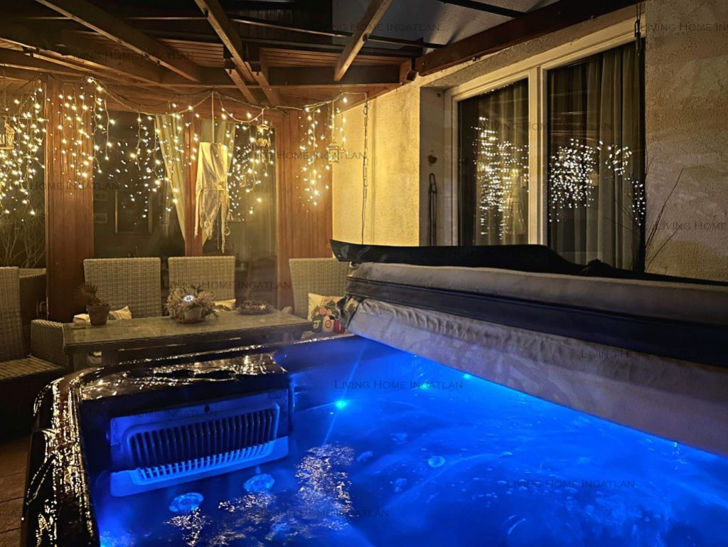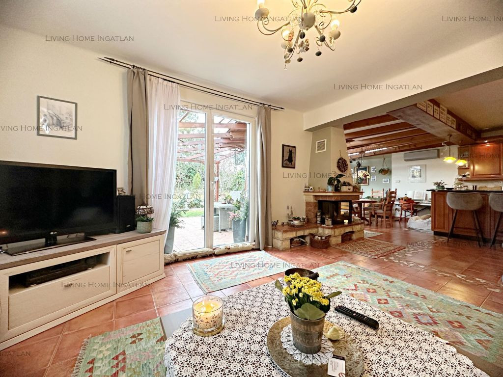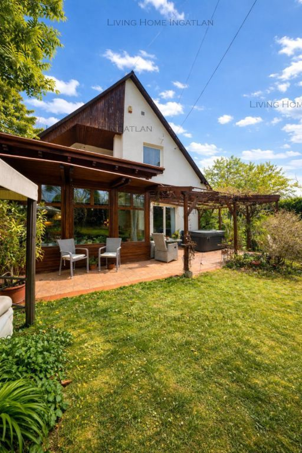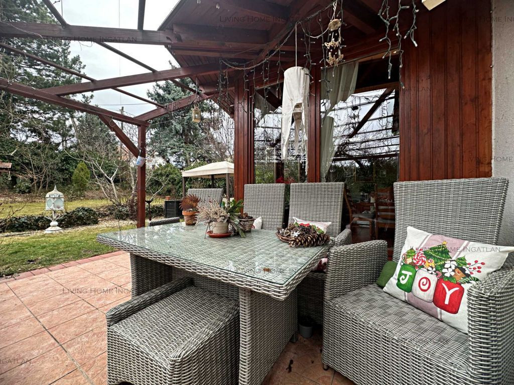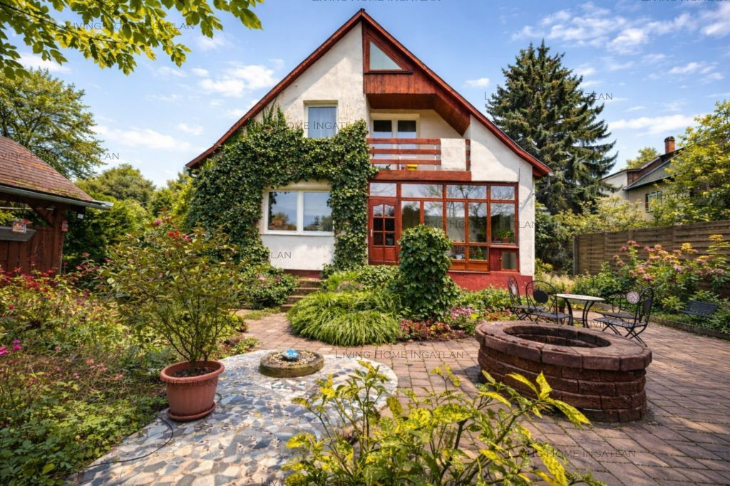 This impressive property is for sale in a newly built family home neighborhood with panoramic views of Nagykevély and Ezüsthegy. The exterior of the house is unique with green vegetation, wooden beams and terraces creating a warm, friendly, Mediterranean atmosphere. The 775 m² garden is planted with ornamental plants, shrubs and flowers, and is illuminated by atmospheric lights in the late evening hours. The relaxation area features a barbecue, a fire pit, a swing bed, and a garden dining area. The paved terrace is the perfect place for summer evenings and gatherings with friends and family.