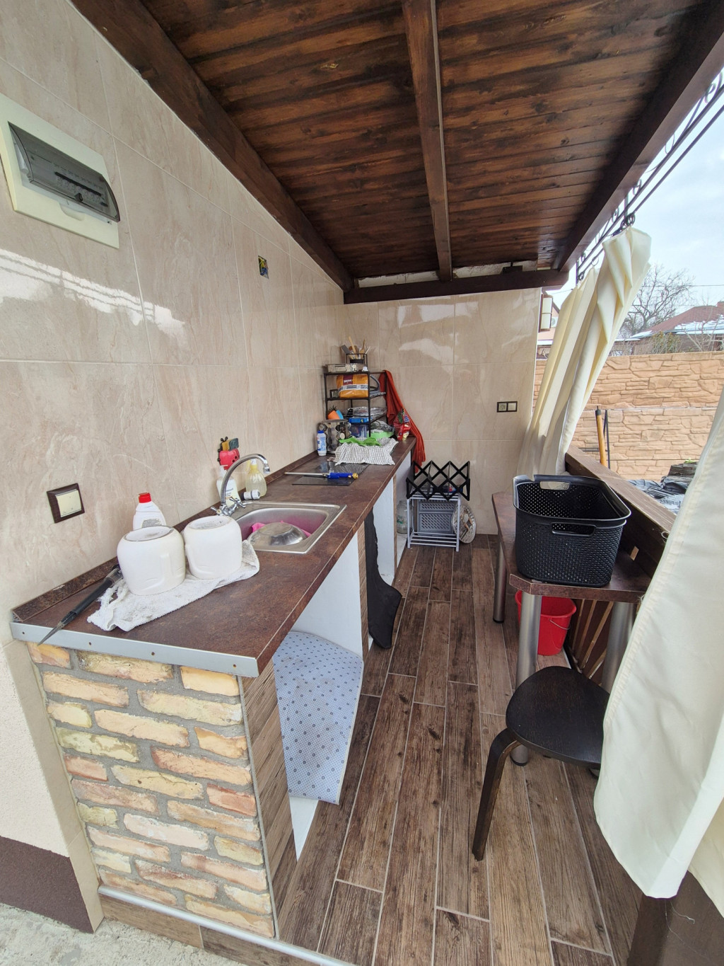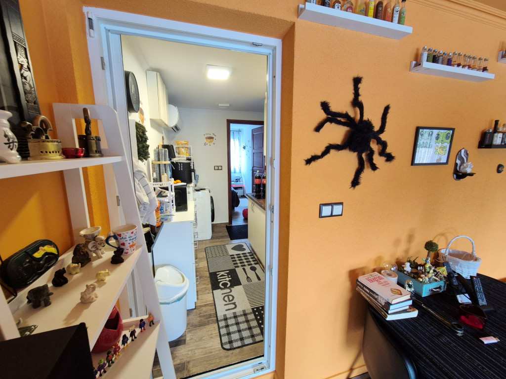 Elosztás: Egy 10m2-es szobából és egy ablakkal rendelkező külön mellékhelyiségből áll, ami 1,62m2-es és egy 4,29m2-es nyári konyhából, ahol pultba épített mosogató, 2 állásos elektromos főzőlappal felszerelt.