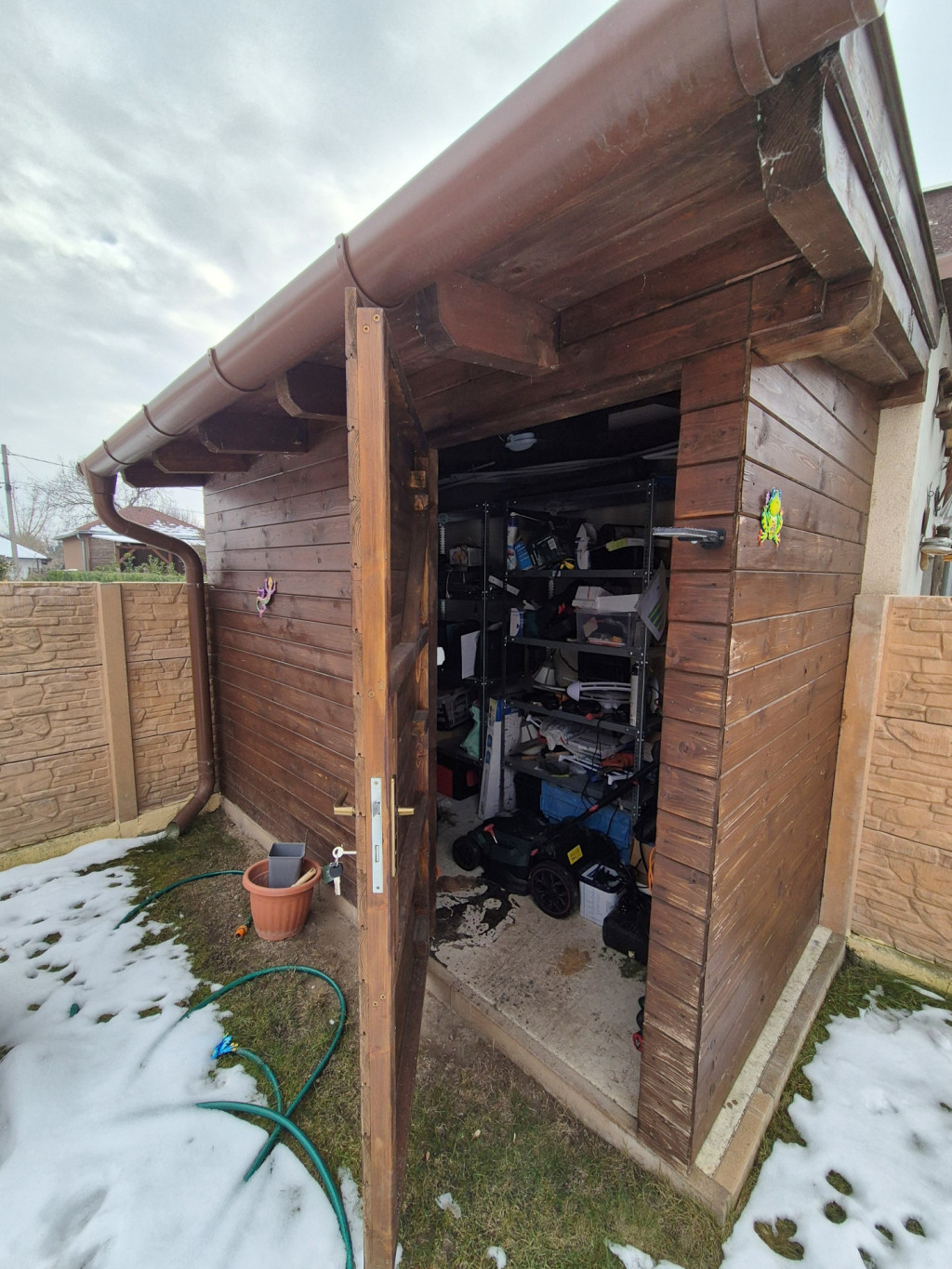 -KERTI SZERSZÁMOS: a telek jobb sarkában egy beton alapra épített ZÁRT kerti szerszámos is elérhető, ami számtalan dolog tárolására alkalmas: sz:1,5m x h: 3,4m-es.