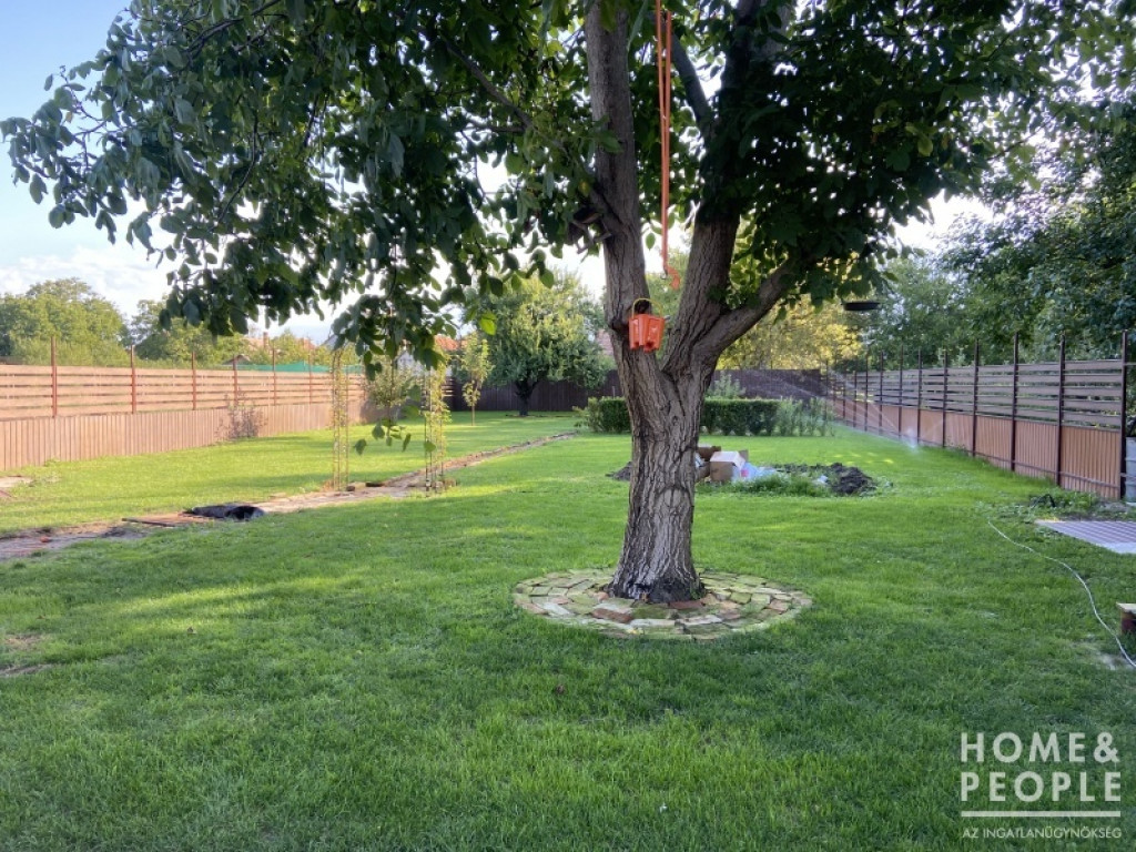 Szép, rendezett, füvesített kert kiépített locsolóberendezéssel, fúrt kúttal