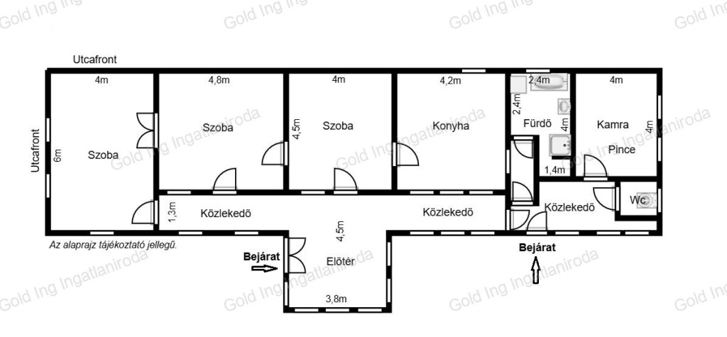 A bejárati ajtón keresztül egy zárt veranda kiszélesített előterébe léphetünk. Ez egy kellemesen világos, tágas helyiség, ami két irányban egy széles folyosóban folytatódik. A verendáról minden helyiségnek külön bejárata van. Azonban a szobák és a konyha, fürdőszoba egymáson keresztül is megközelíthetőek.