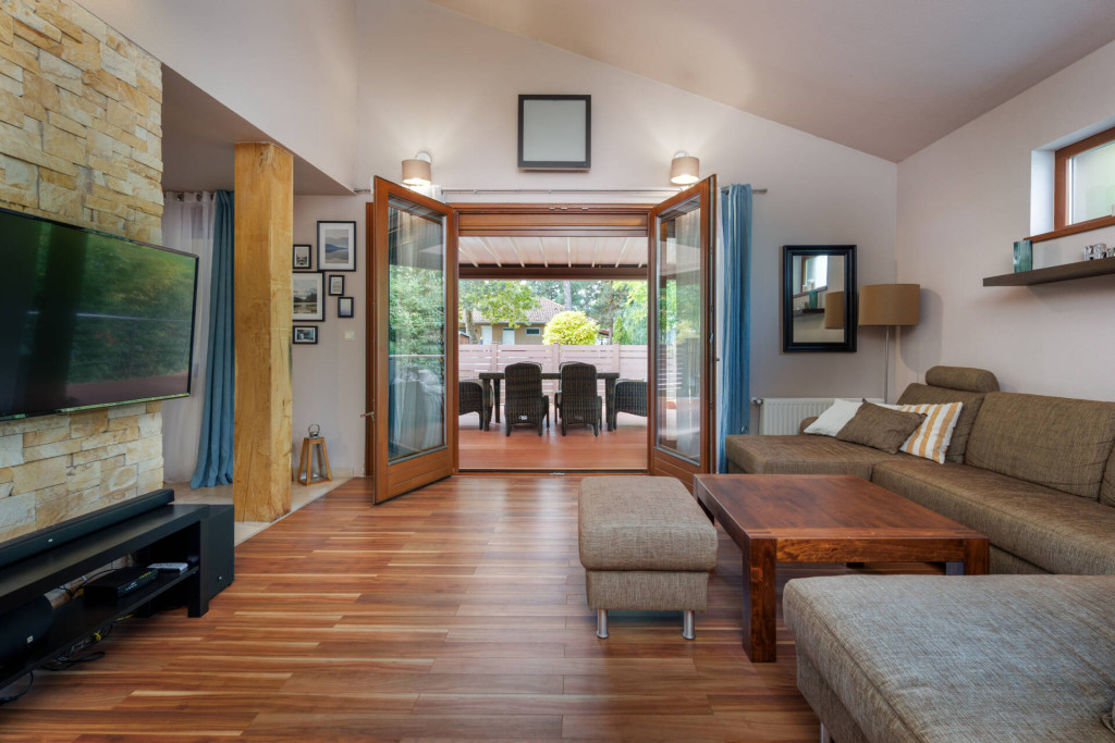 A nappaliból közvetlenül nyílik a 40 m²-es, fedett, nyitható tetejű terasz –ideális hely a családi összejövetelekhez, pihenéshez vagy vendégfogadáshoz.