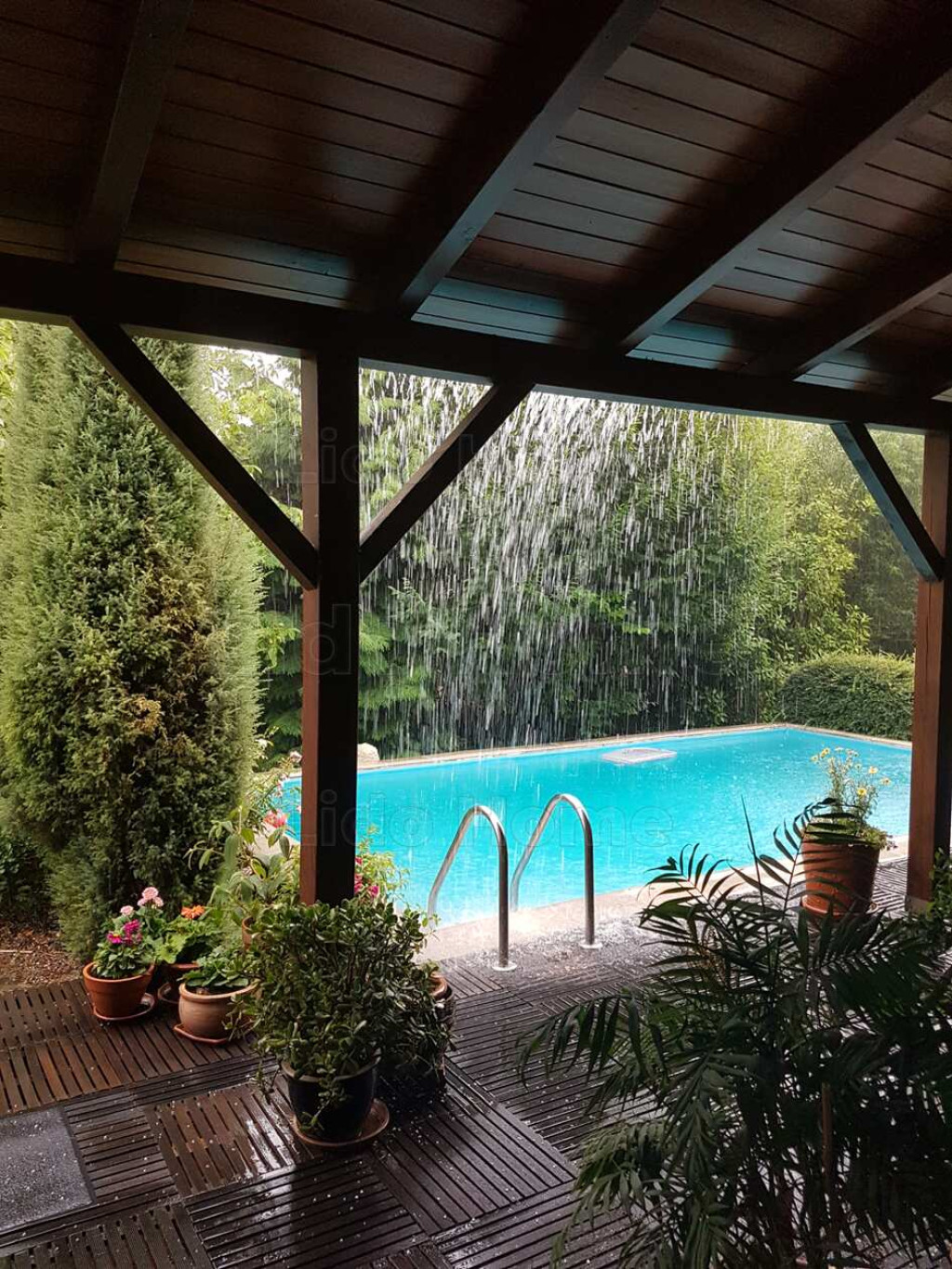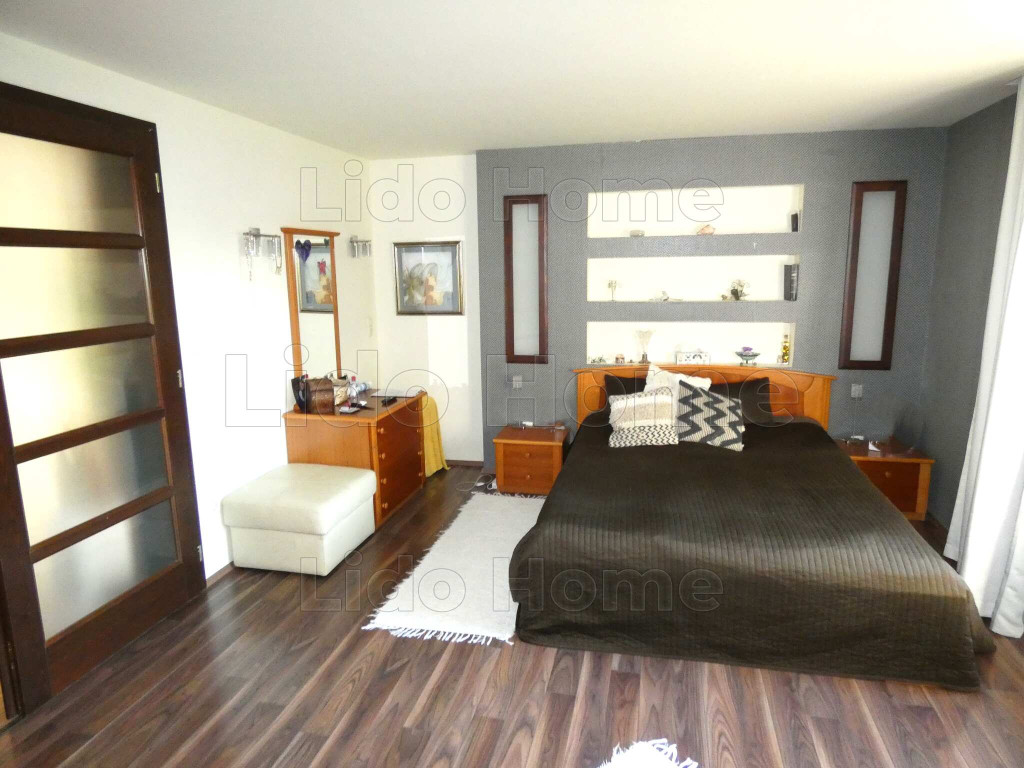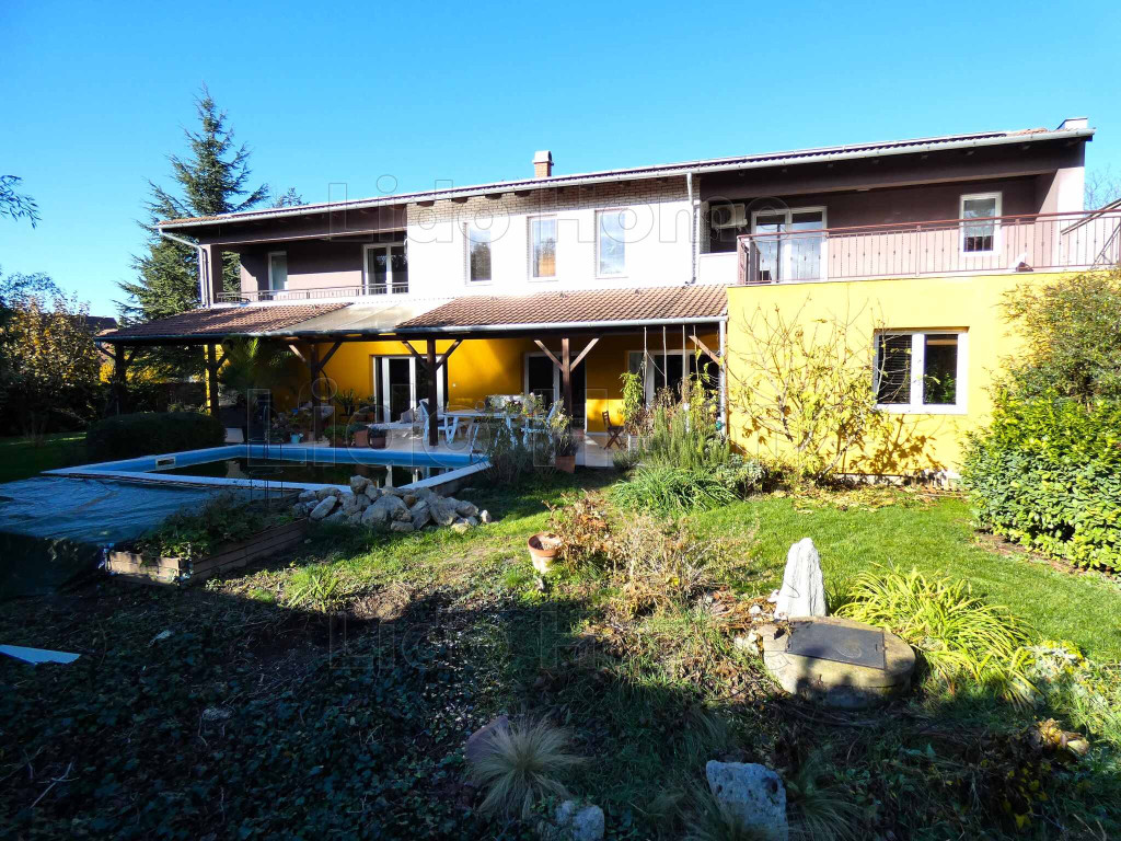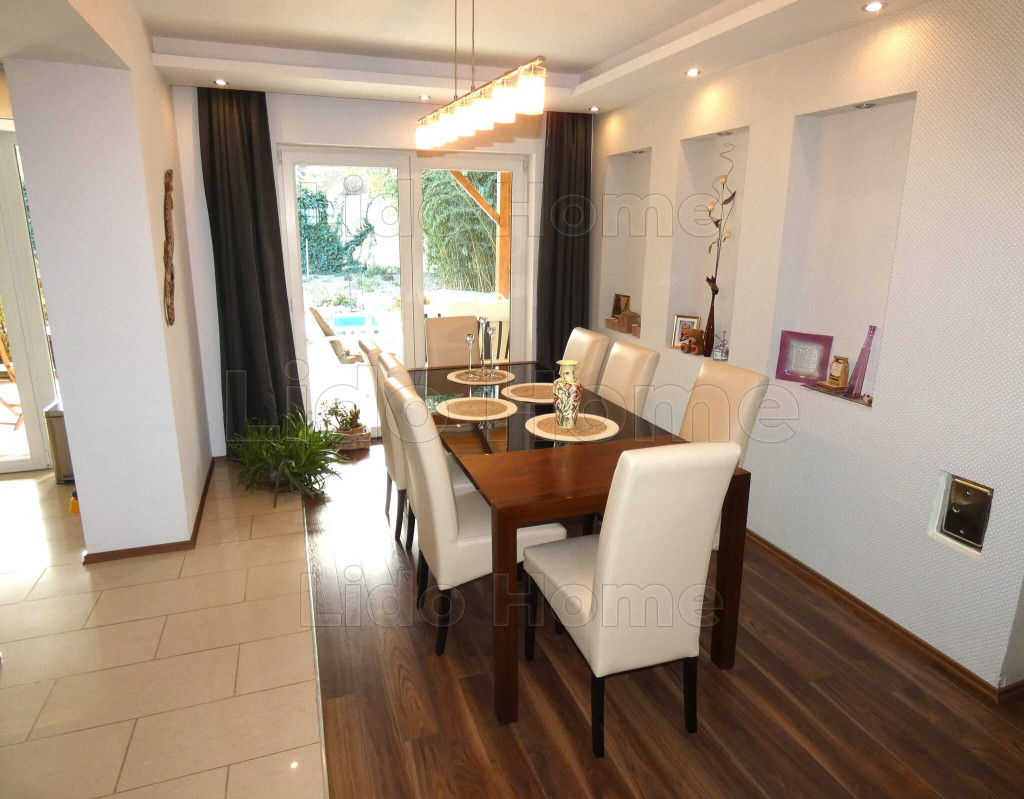 -földszintjén nappali, konyha, étkező, 2 szoba külön fürdőkkel, háztartási helyiség, egy hatalmas dupla garázs, valamint egy 7x4 m-es úszómedencével egybe épített 50 m2-es fedett terasz található,