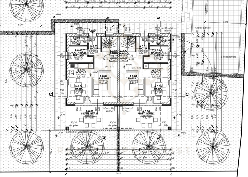 - Falazat: Leier 30-as kerámia falazóelem, válaszfalak Leier 10-es falazóelemekből