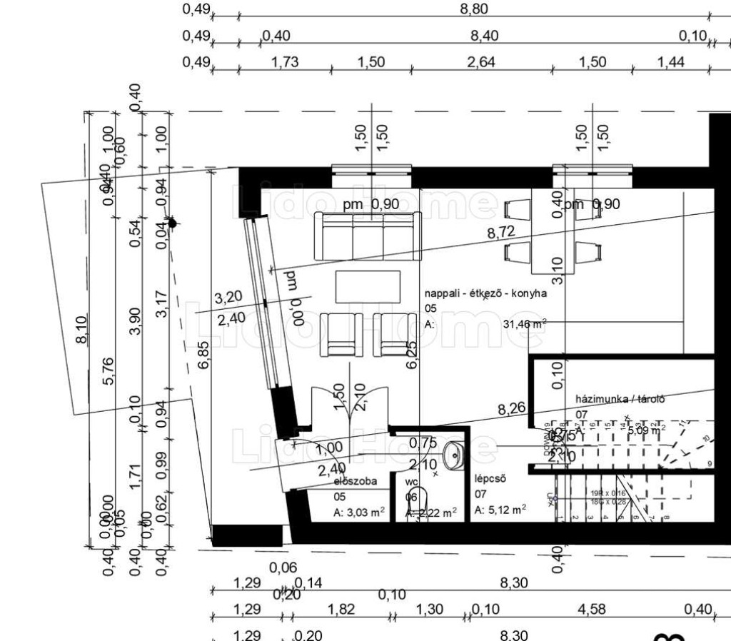 Ezen hirdetésben szereplő 90 m2 alapterületű lakóház elosztása: