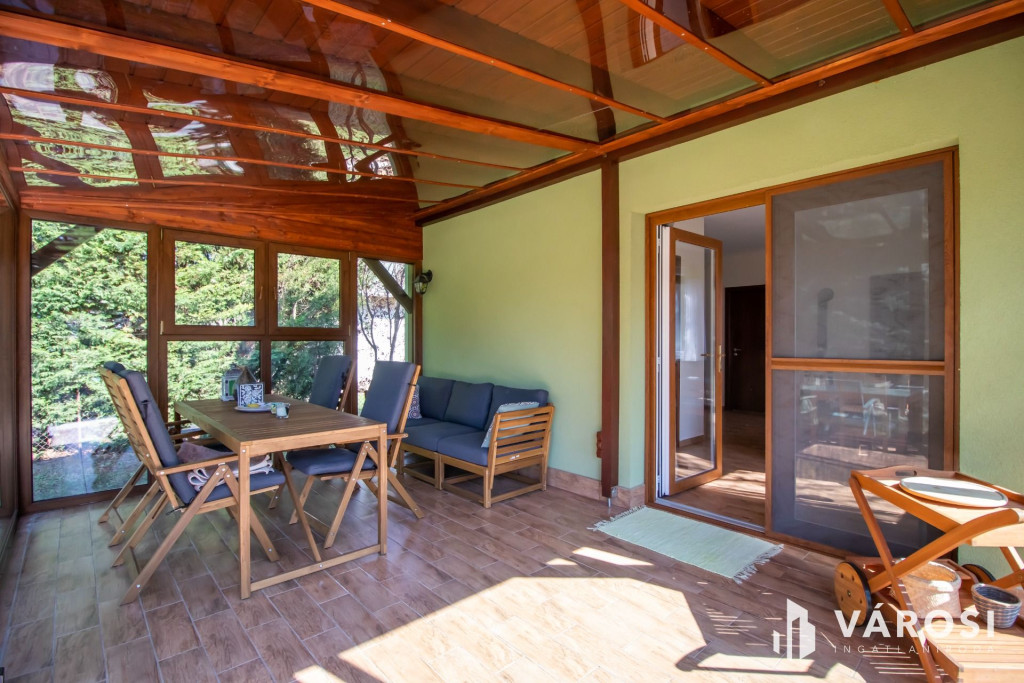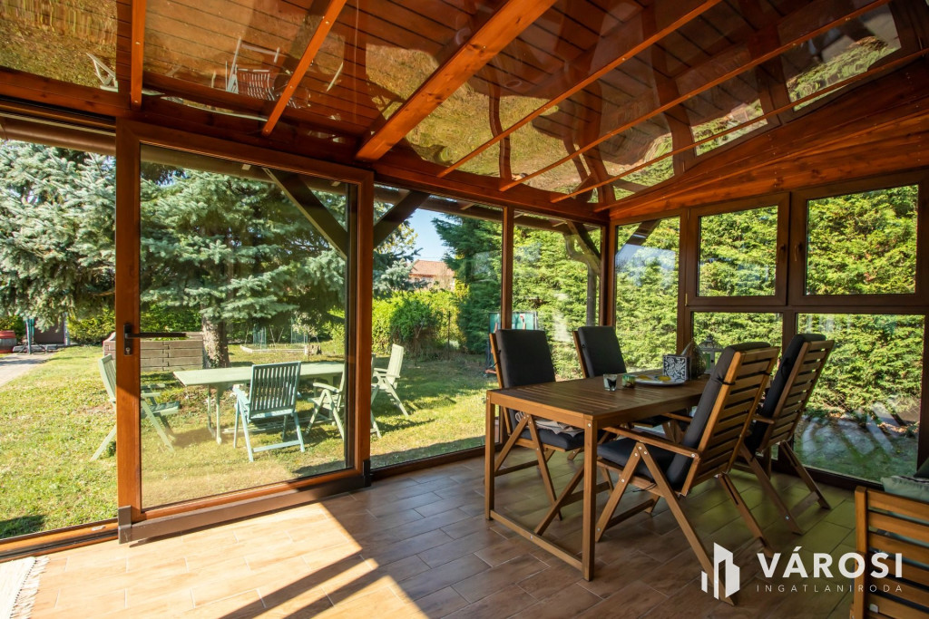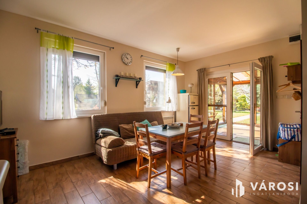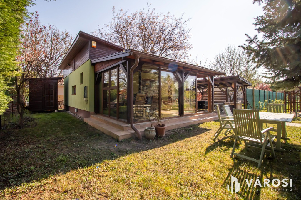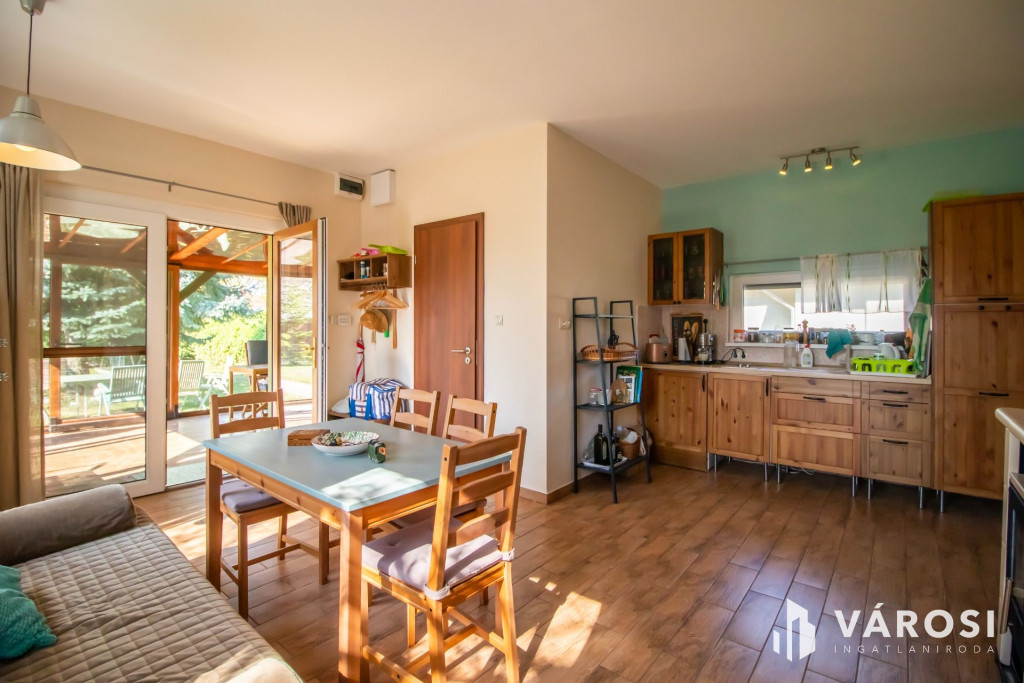 Az 577 négyzetméteres telken épült, 62 négyzetméteres, szigetelt, tégla falazatú házban amerikai konyhás nappali étkezővel, 2 szoba és fürdőszoba található. A ház előtti terasz be lett építve, 3 rétegű üvegezéssel ellátott oldalfalakkal és hatalmas tolóajtóval. Ezeket kinyitva, közvetlen kapcsolat nyílik a csodás kerthez. Akár mind a 4 évszakban használható! Az életteret növeli a ház mellé épített szabadtéri konyha is. A ház igény szerint a teljes berendezéssel együtt eladó.