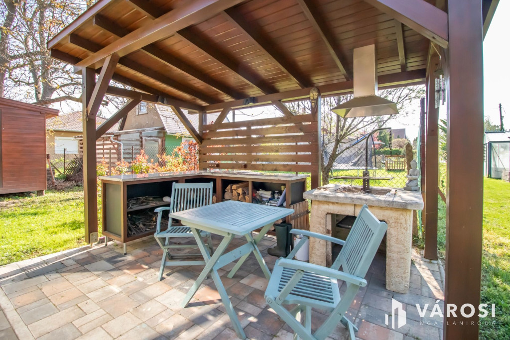 A ház mellett további kettő kis tároló került megépítésre, a kerti eszközök tárolására. Hangulatos kerti grillező is kialakításra került, de van még hely medencének, játszótérnek stb. Ideális lehet, akár kerti partiknak vagy a család kedvenceinek, akik kedvükre szaladgálhatnak majd rajta. Parkolni az udvaron épített kocsibeálló alatt, előtte vagy az utcán is lehetséges. A kapu távirányítóval vezérelhető, motoros működésű.