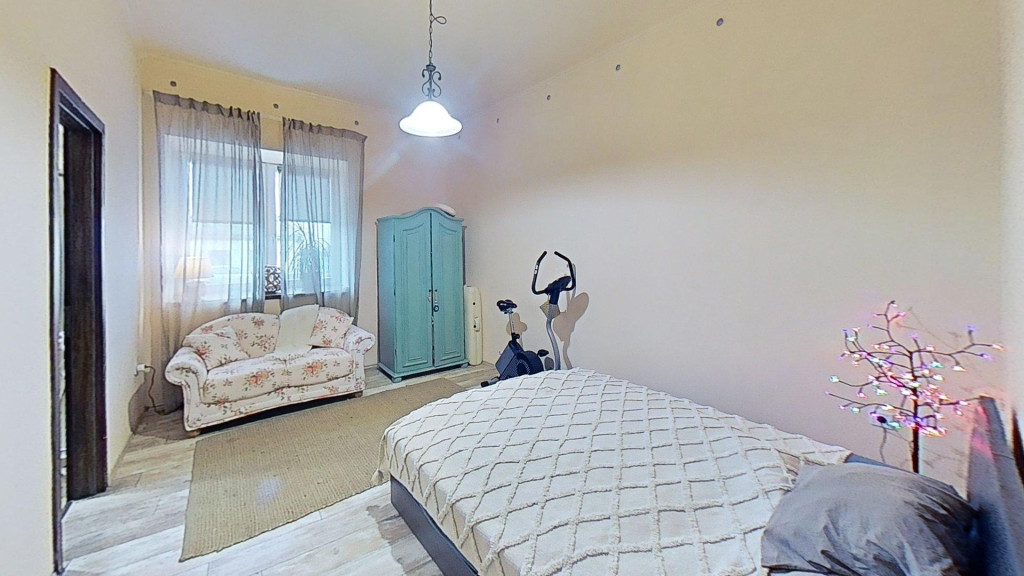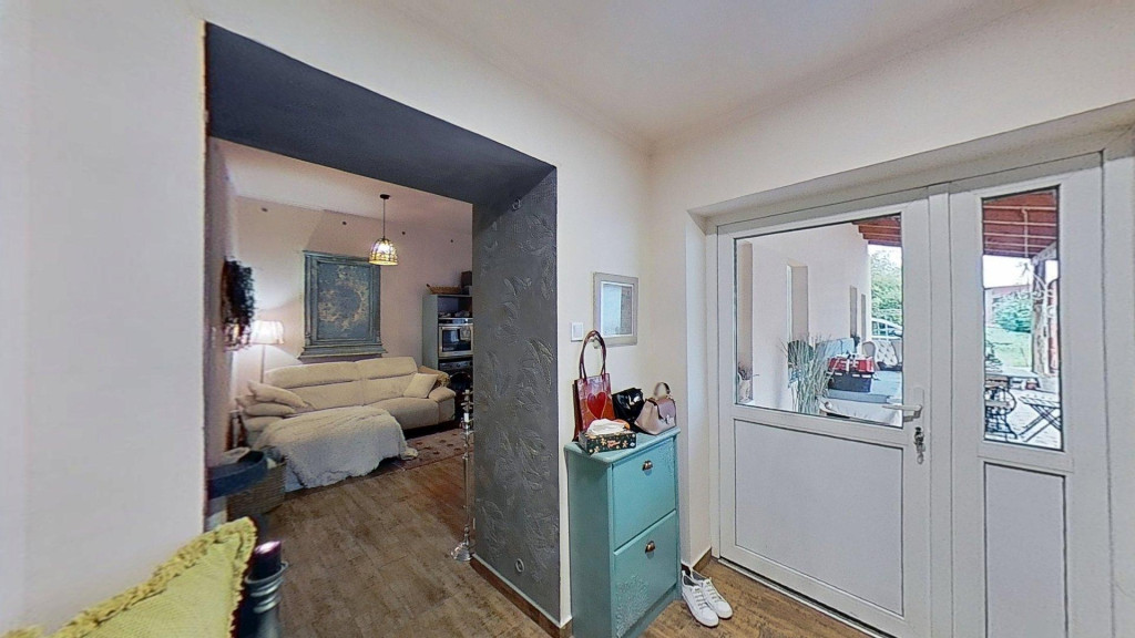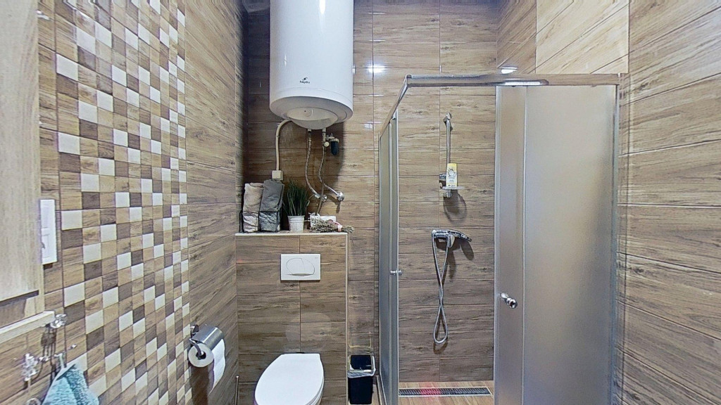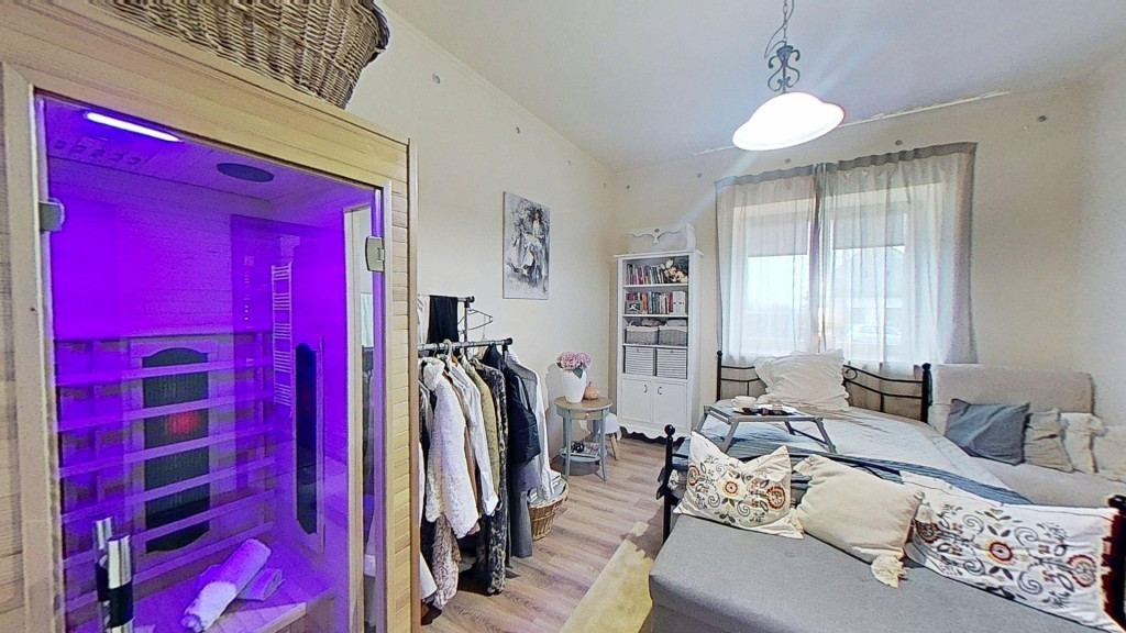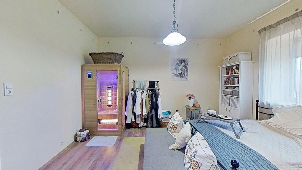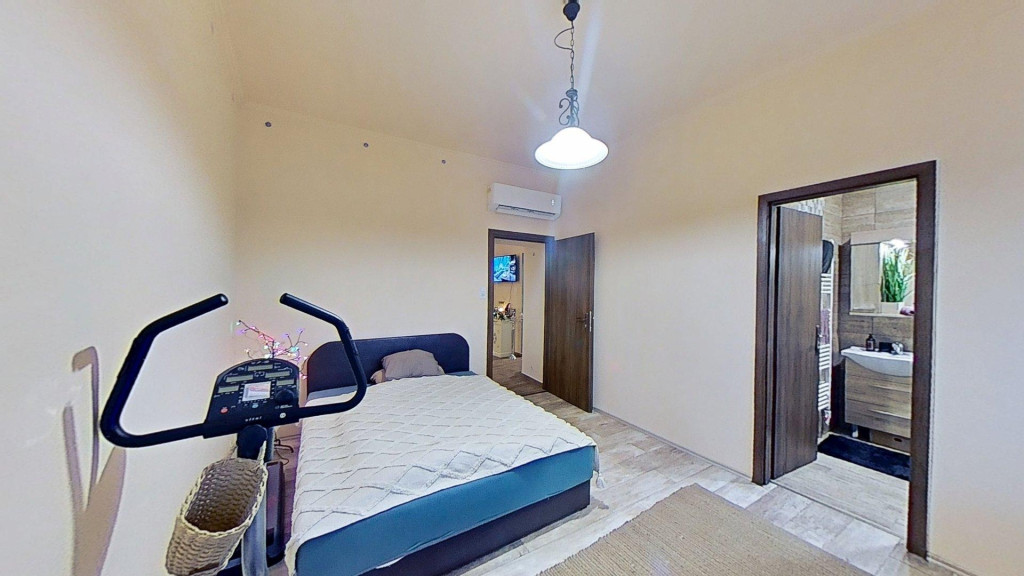 A ház földszintes, két bejárata van, melyek előtt egy 30 m2-es fedett terasz került kialakításra. Belső hasznos területe 85 m2, egészen egyedi, pazar belső bútorzattal, melyek a vételár részét képezik. Funkcióváltásra is alkalmas, hiszen 3 különálló szoba került kialakításra, és mindegyik rendelkezik saját fürdőszobával, ezen túl egy gardrób és egy előszoba alkotják a belső tereit. Ez utóbbi a későbbiekben épült az eredetileg L-alakú alaprajzú házhoz, a 2019-es felújítás alkalmával. Tehát az épület alkalmas jelenleg 2 vendégapartman kialakítására is, amennyiben valaki befektetési szándékkal vásárolna.