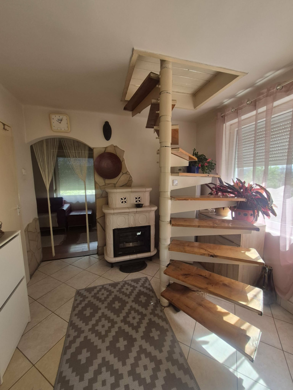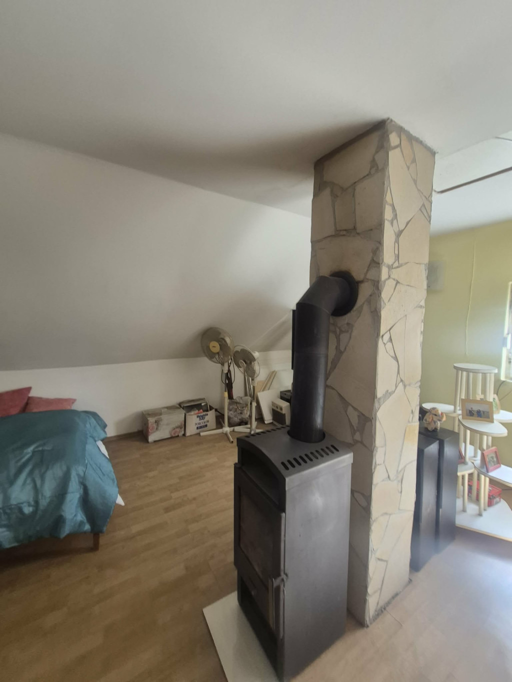 Az étkezőből lehet lépcsőn feljutni az emeletre, amely egy tágas tér, ahol jelenleg egy hálószoba található.