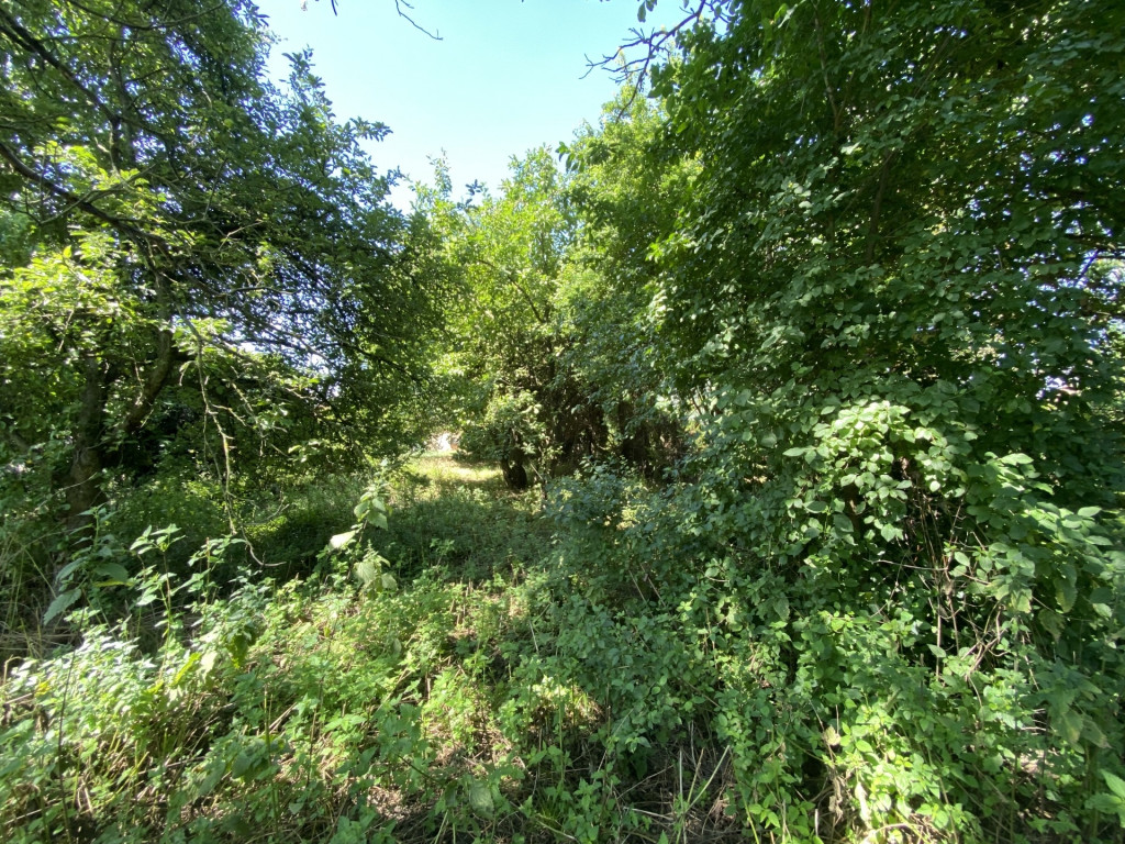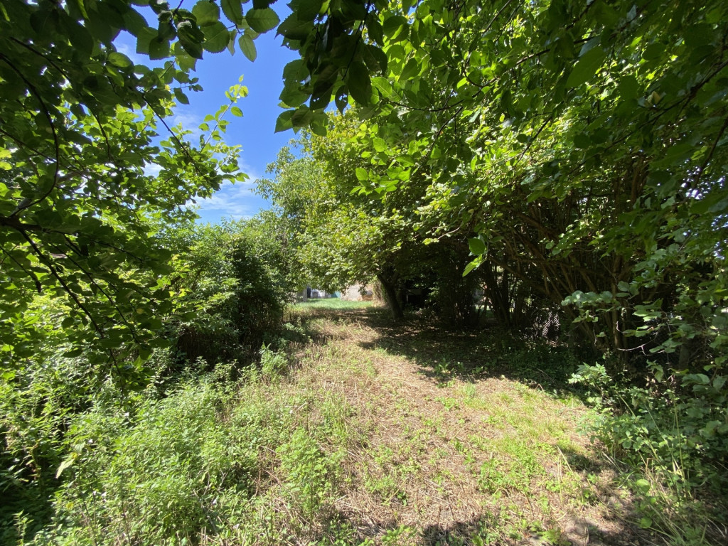 A telek első része rendezett, hátsó része árnyas, fákkal benőtt.