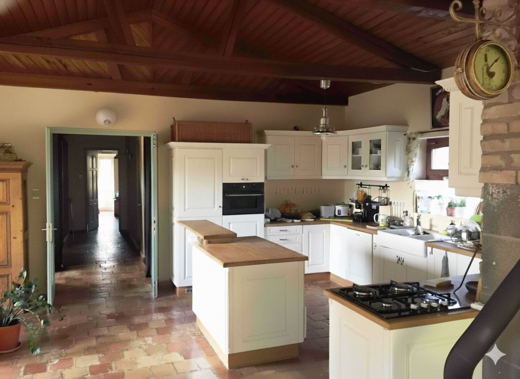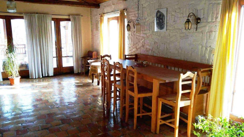- A nappali-konyha központjában álló öntöttvas-kályha melegséget és rusztikus eleganciát sugároz, kiegészítve a helyiségeket borító rusztikus kő padló burkolattal.