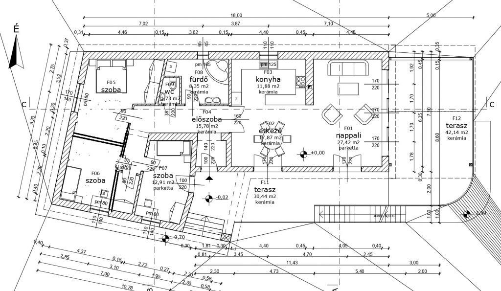 Helyiségek: nappali (21,4 nm), konyha (11,9 nm), étkező (17,9 nm), 3 szoba (13,5 és 12,9 és 11 nm), 2 fürdő (7,1 és 3,2 nm), kamra (4,7 nm), közlekedő (17,4 nm), gardrób (2,6 nm) és extra beépíthető tetőtér (42 nm).