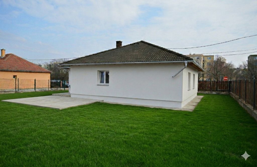 A ház egy 850 nm-es telek egyik felén kapott helyet, 436 nm saját használatú teleken újépítésű egyszintes, nappali plusz 2 hálószobás, összkomfortos, terasszal, kocsi beállóval, önálló családi ház épül! A ház elrendezése nagyon jó! Az előszobából balra a nappali-konyha együttesébe jutunk, és innen nyílik az északra néző terasz is. Az előszobával szemben a fürdő, és a közlekedőn jobbra nyílik a 2 hálószoba és a háztartási helyiség!