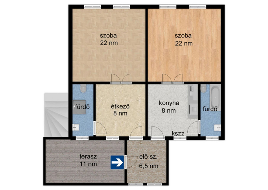 - Szobák parkettával borítva a többi helyiség hideg burkolatos.