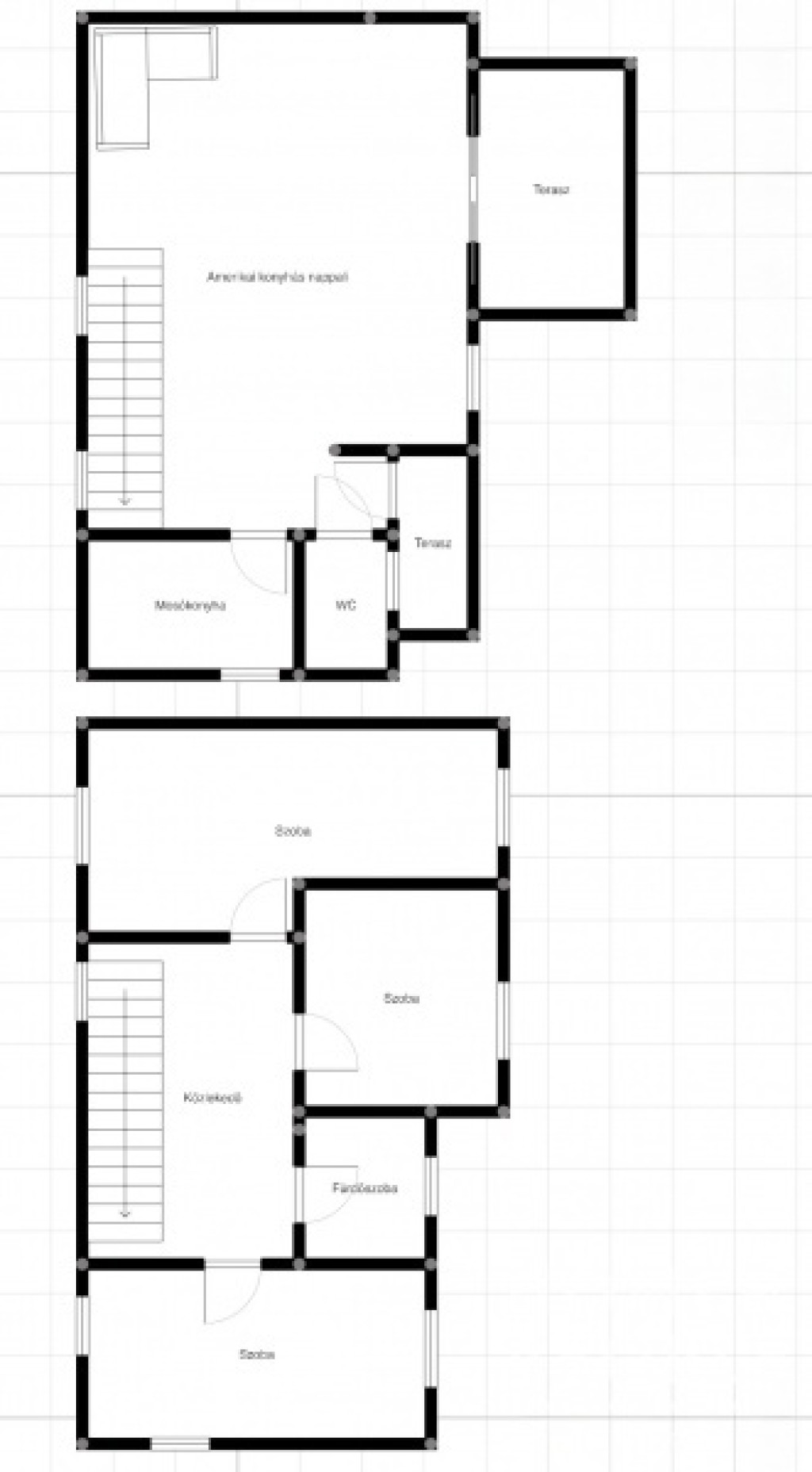 Földszint: előtér, nappali, konyha, wc, mosókonyha, terasz