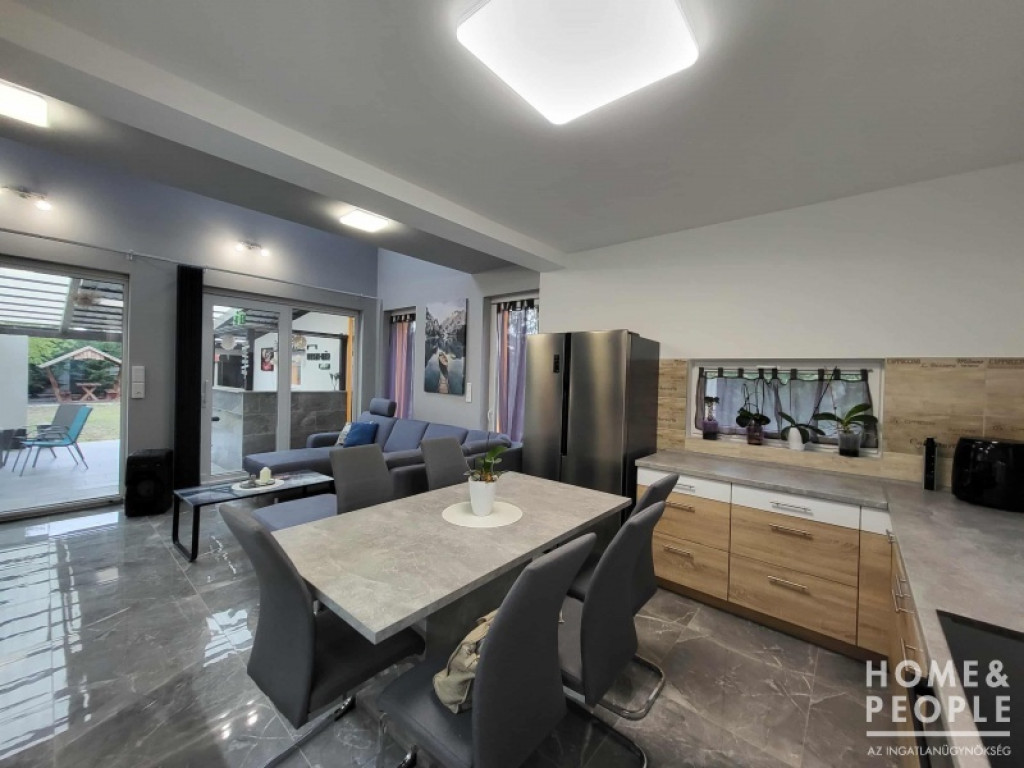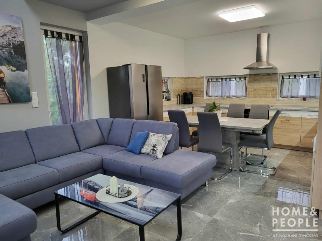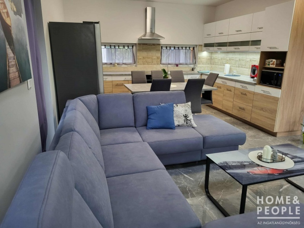 40 m2-es amerikai konyhás nappali + 4 szoba, 2 fürdőszoba, wc, terasz (80 m2),