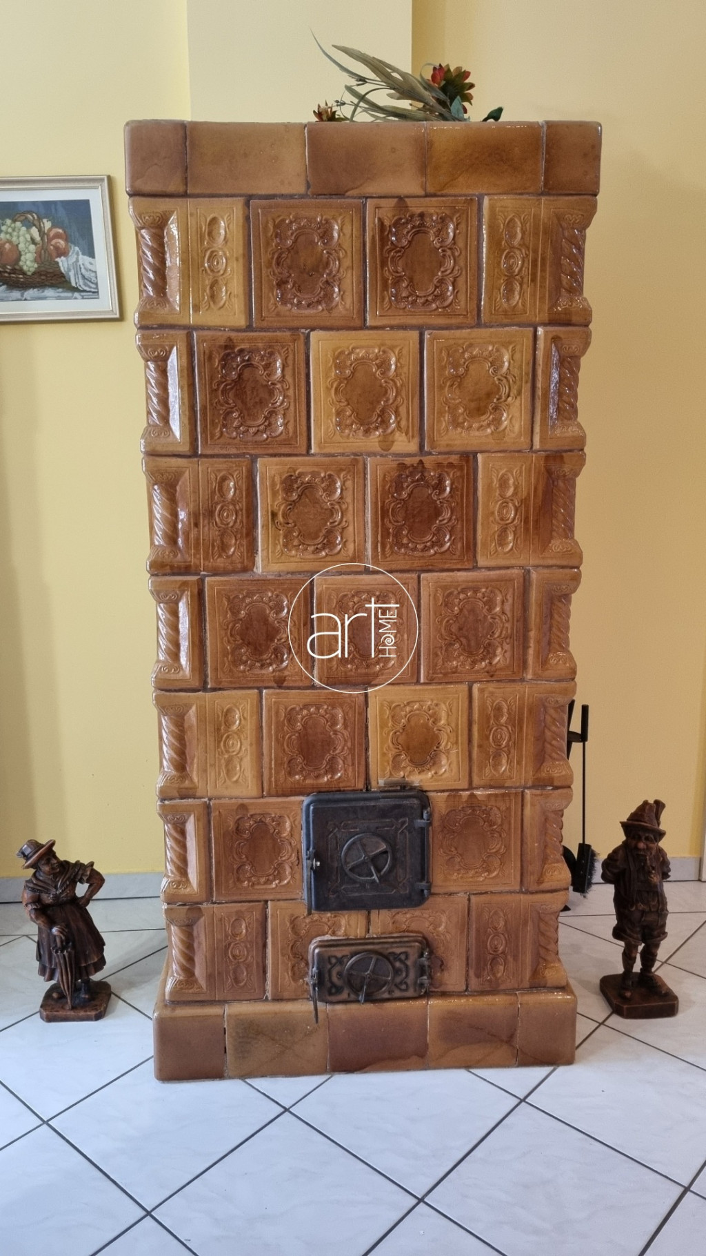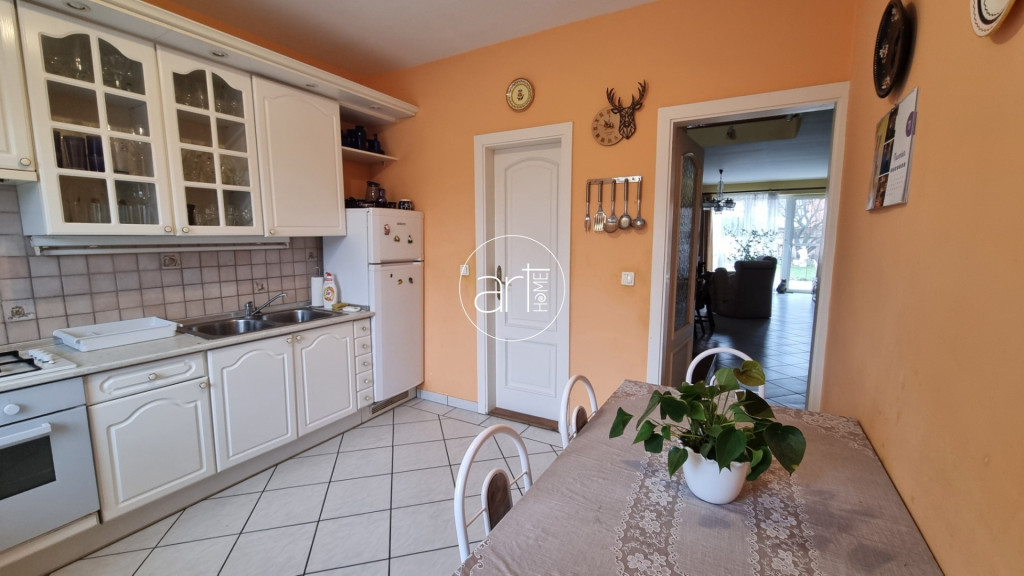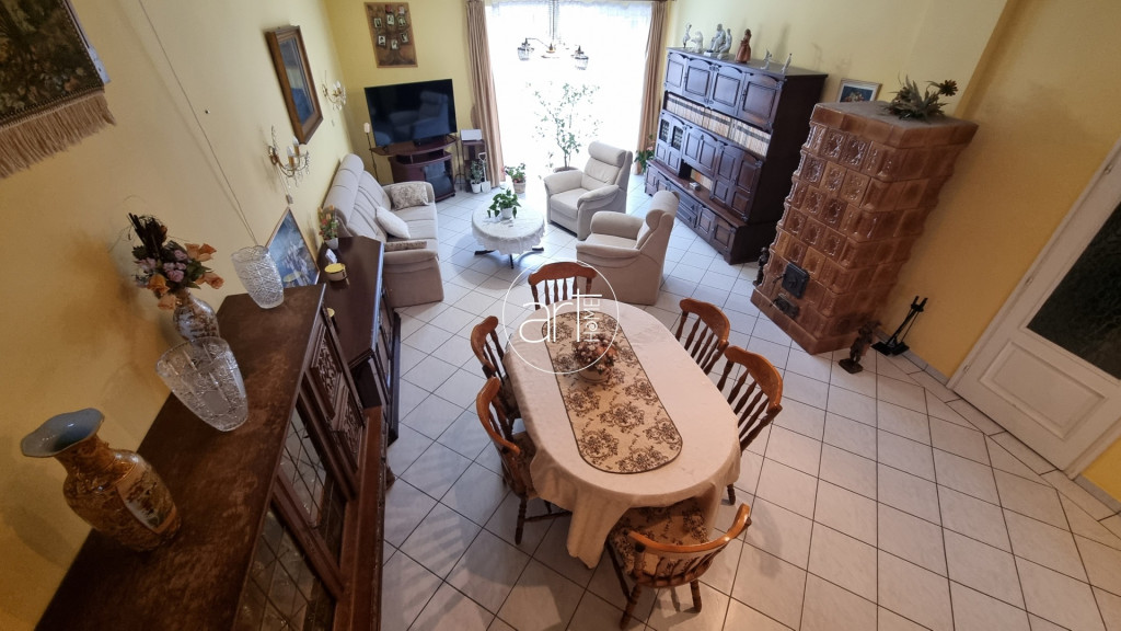 Az alsó szinten egy hatalmas nappali - étkező található, amelynek ékét egy cserépkályha valamint a hatalmas , közel 5, 5 méteres belmagasság adja. Az elszeparált konyhához egy kamra is tartozik.