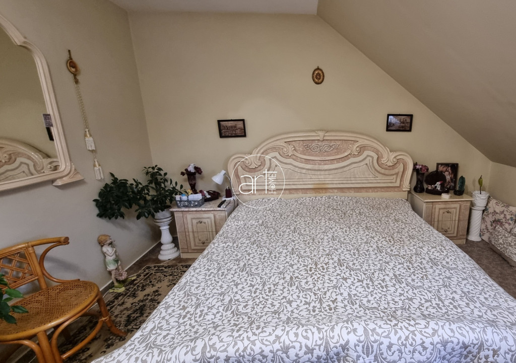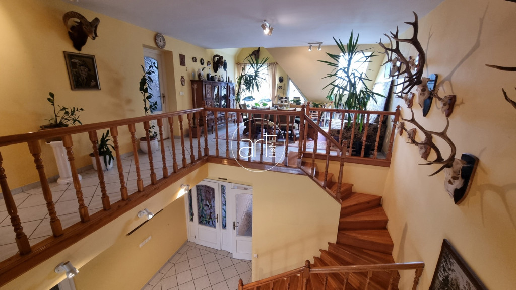 A felső szintre fa lépcsőkön juthatunk. Itt 3 különnyíló szoba, egy szintén tusolós és kádas fürdőszoba, valamint egy külön wc került kialakításra. A nyitott galéria fa korlátokkal eleganciát sugárzó, a ferde falakkal határolt részben akár egy pihenő vagy olvasósarok is méltó helyet kaphatna.