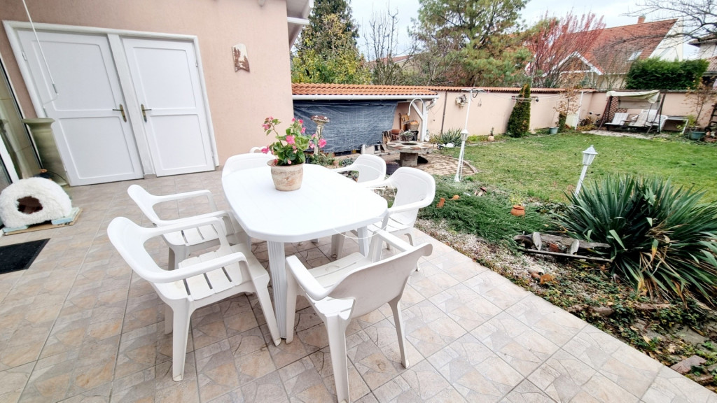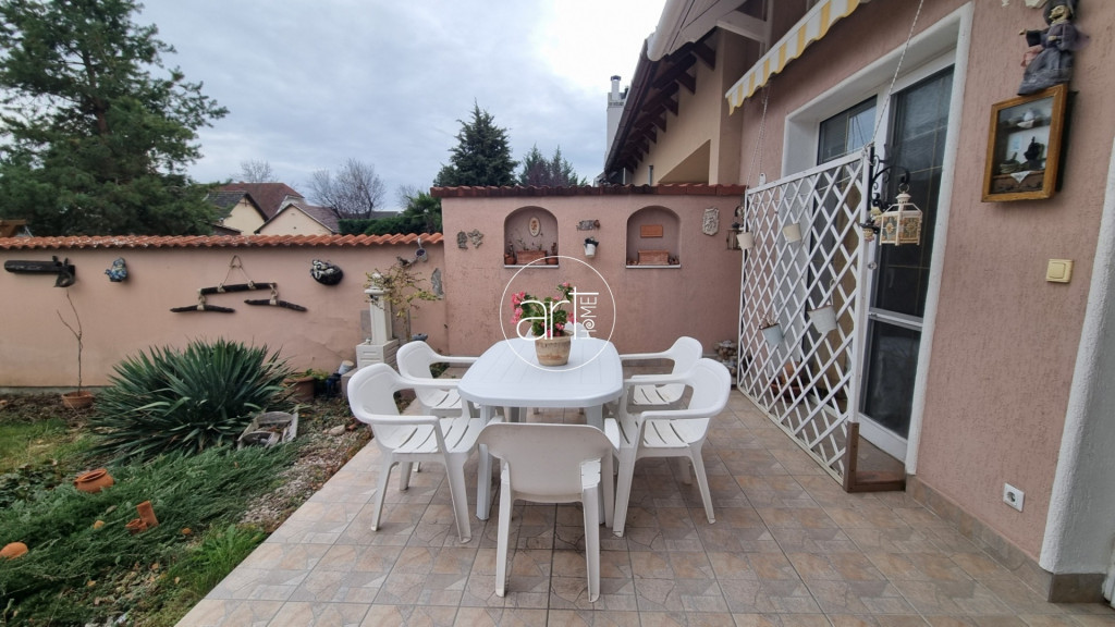 Közel 20 m2-es burkolt terasz fokozza a kinti kényelmet, innen közelíthető meg egy kisebb pince és egy tároló.