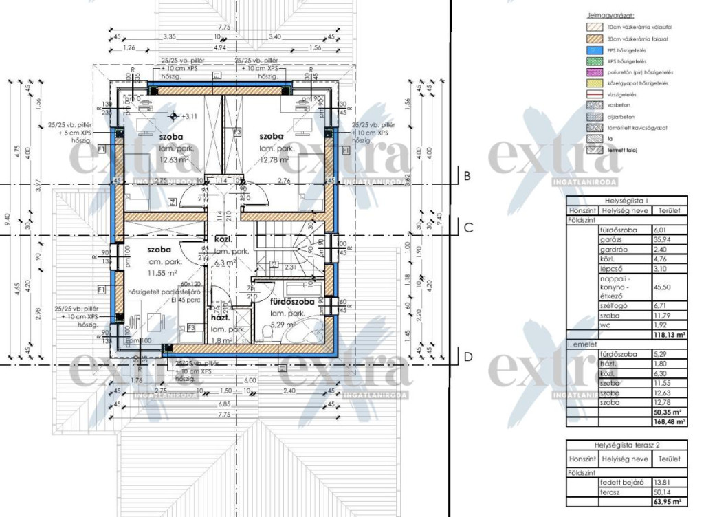 - 4 hálószoba (12,78m2, 12,63m2, 11,79m2, 11,55m2)