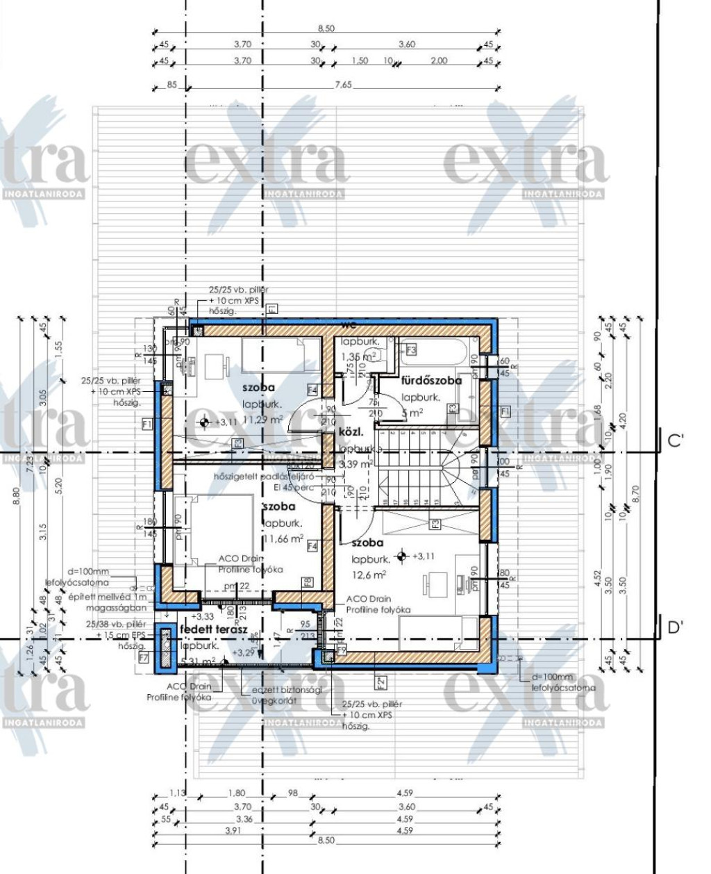 - tágas szélfogó/közlekedők (4,40m2, 3,39m2, 8,71m2)