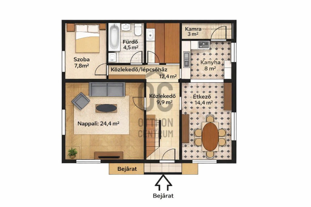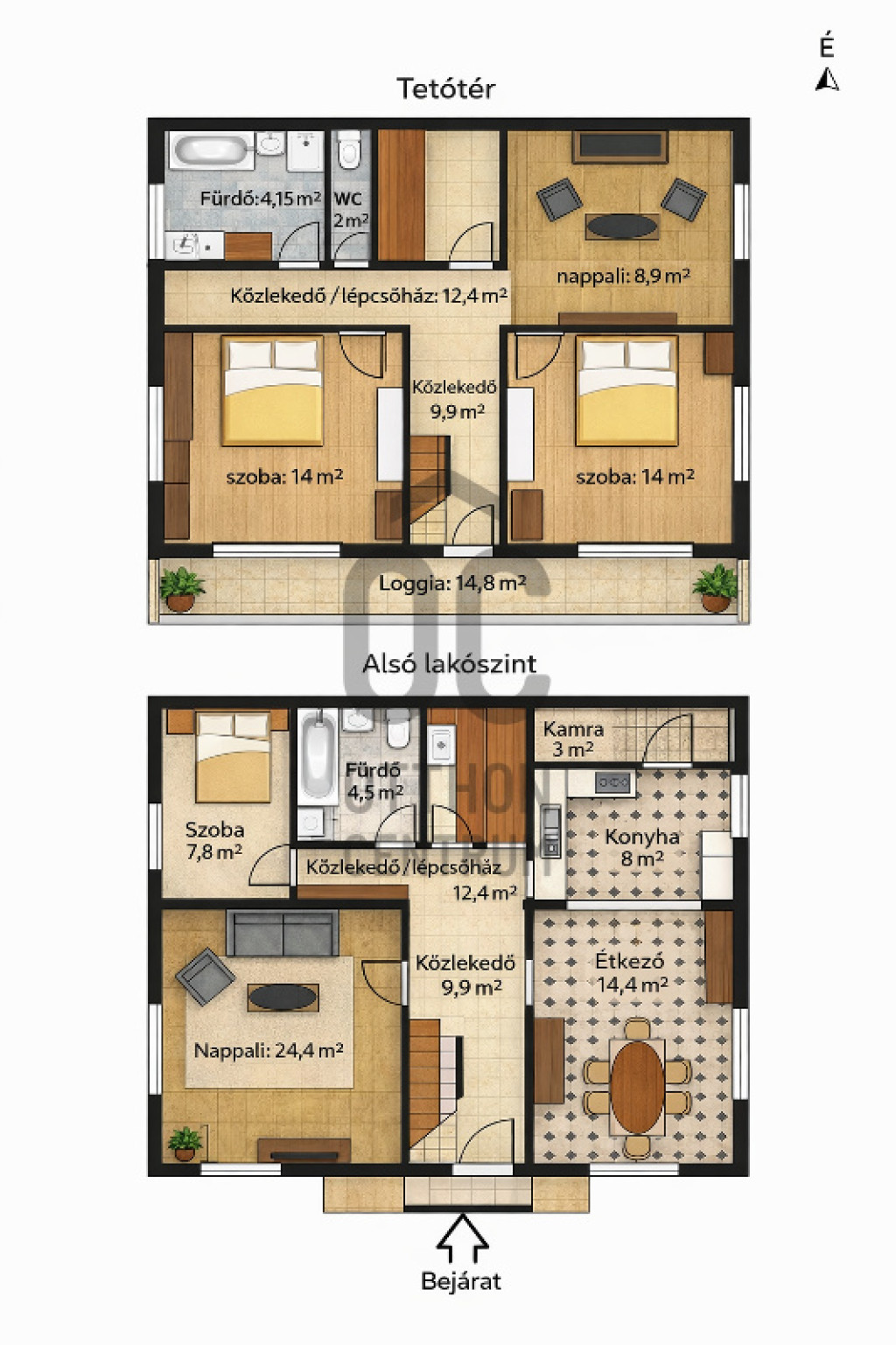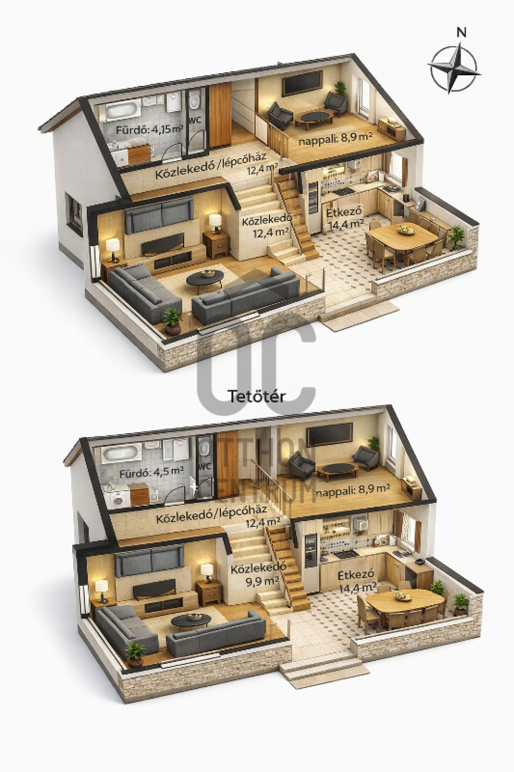 A ház legnagyobb előnye a tér és a praktikus elrendezés. A világos helyiségek és a jól elkülönülő életterek minden családtagnak kényelmes életteret biztosítanak.